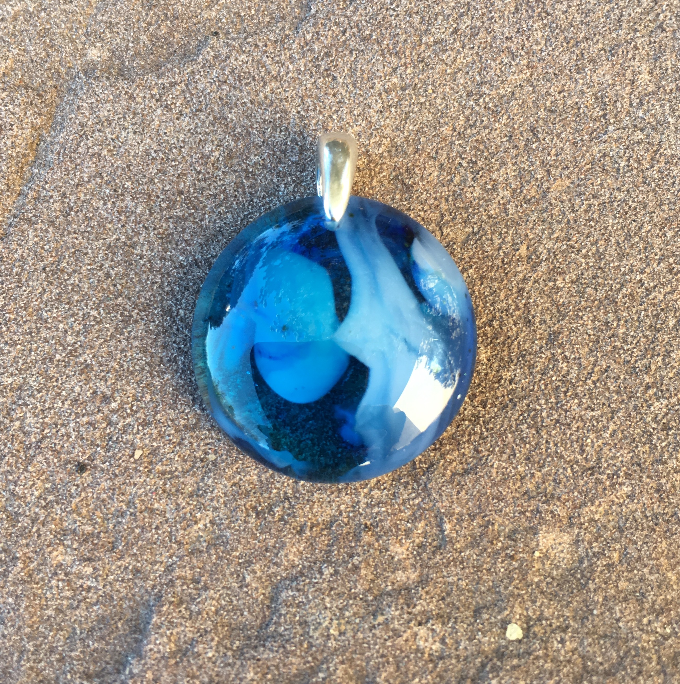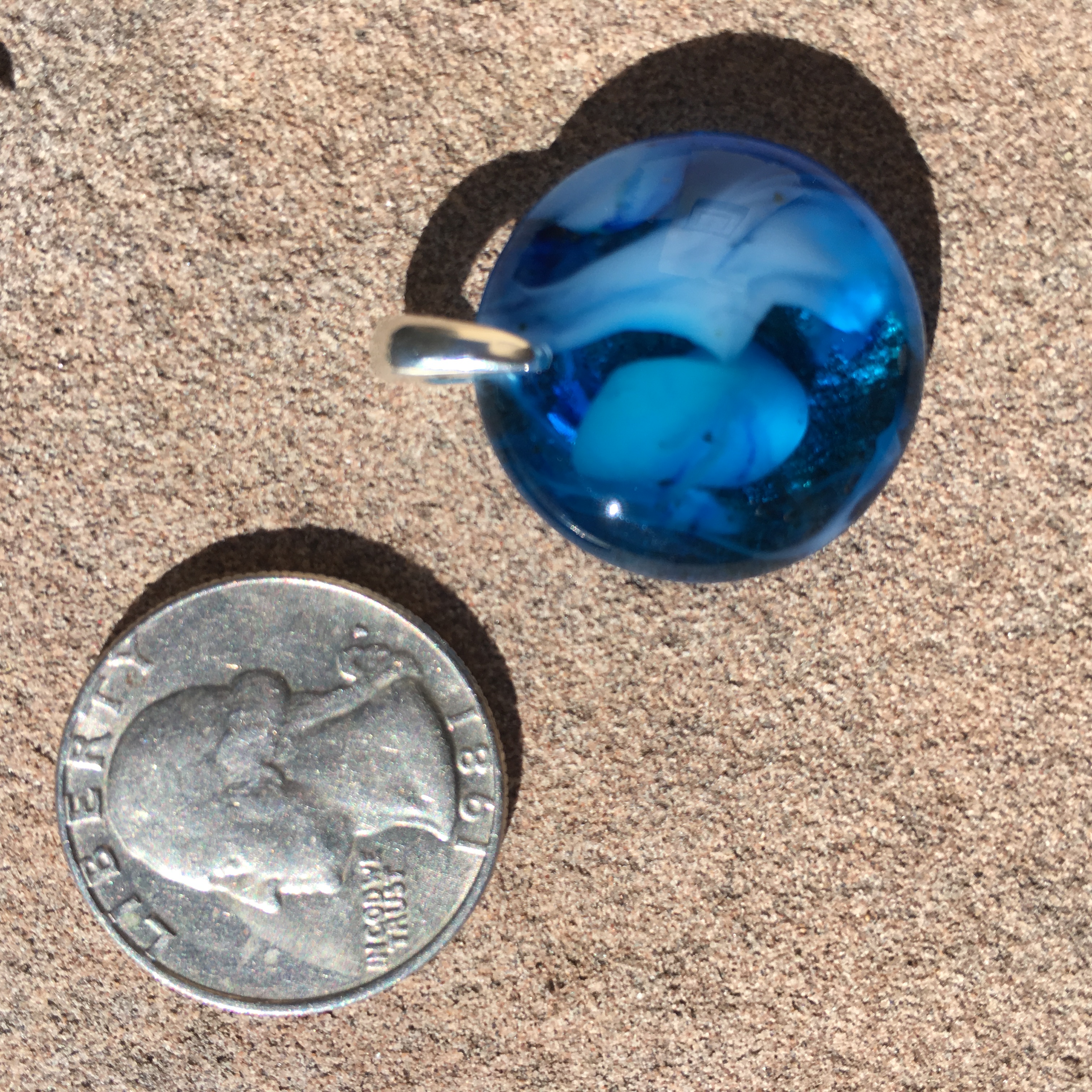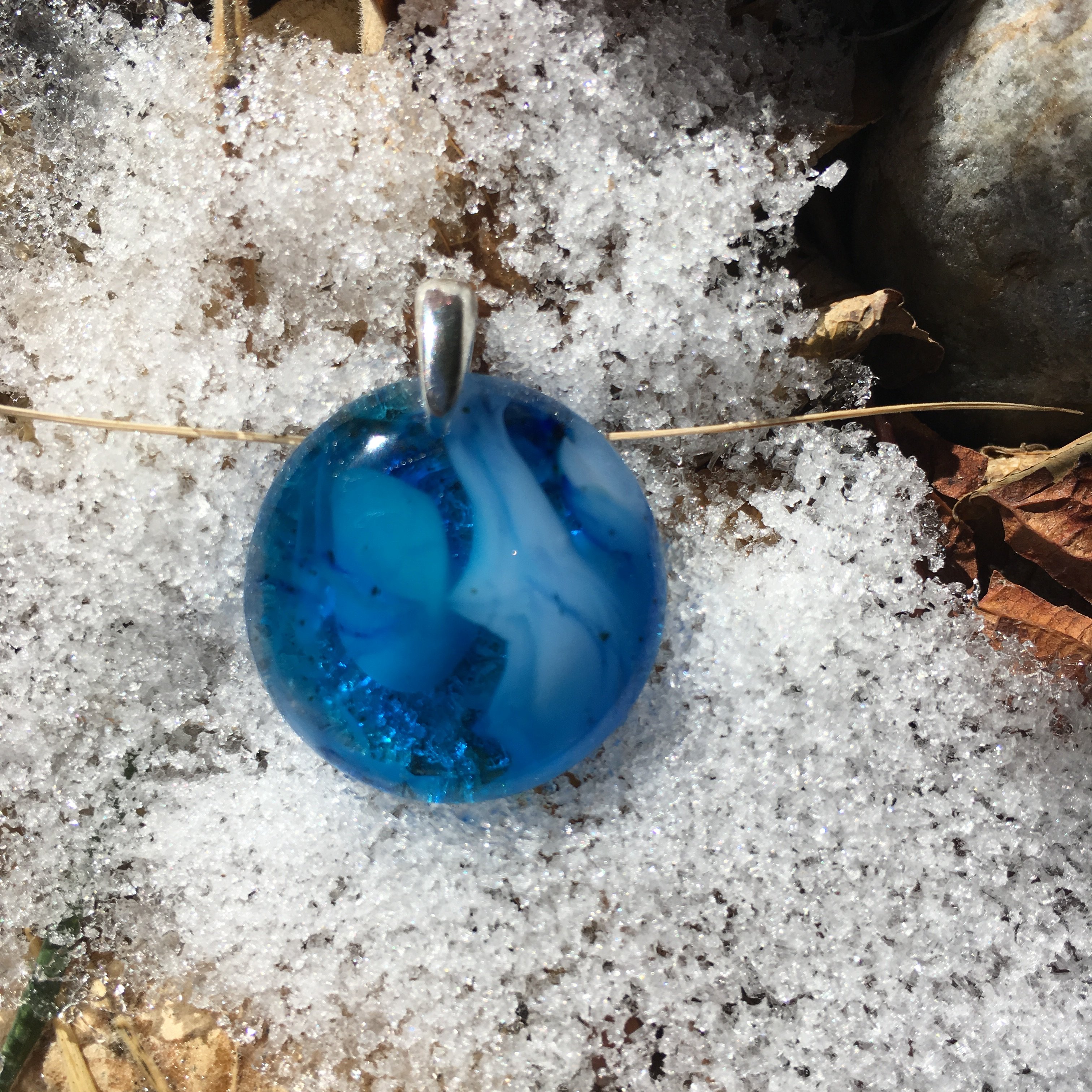 A blue spectrum of glass swirls in the depths, reminiscent of glacier ice, sometimes with a sparkle of silt. All pendants come with a black waxed cotton cord, but check out the silk ribbons for another fun way to wear it. Bail is sterling silver.