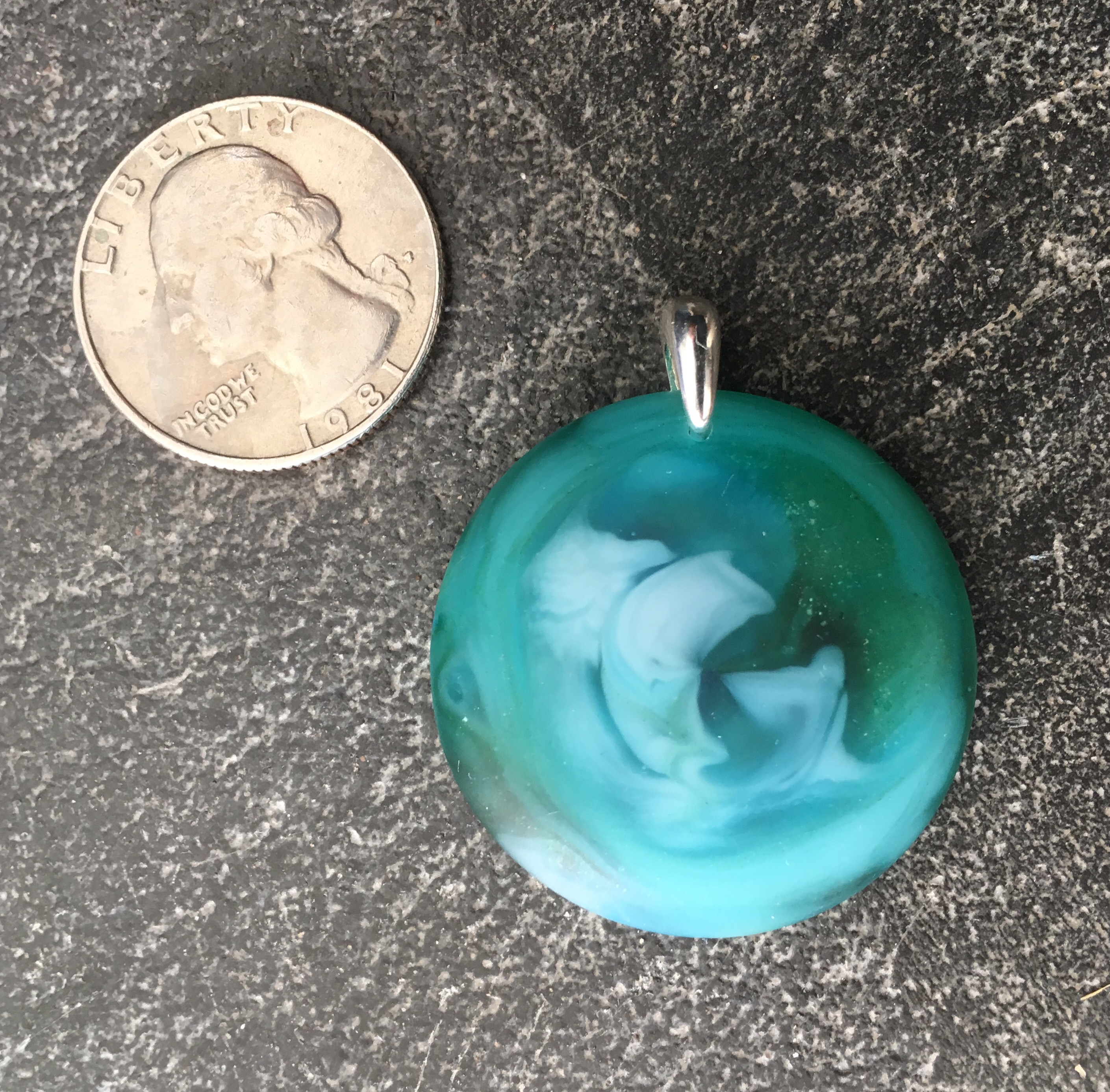 A blue-green spectrum of glass swirls in the depths, reminiscent of glacier ice, this one has been tumbled to give a texture like beach glass! All pendants come with a black waxed cotton cord, but check out the silk ribbons for another fun way to wear it. Bail is sterling silver.