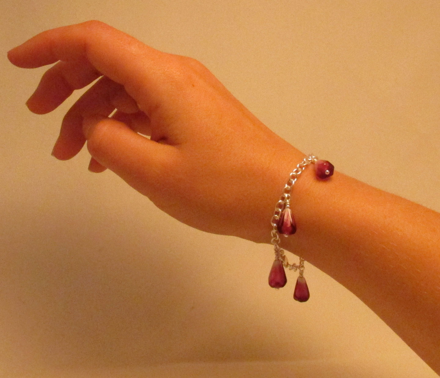 6 hand-sculpted glass pomegranate seed beads hung on a 7 inch sterling silver bracelet chain. Fastened by a small lobster clasp.