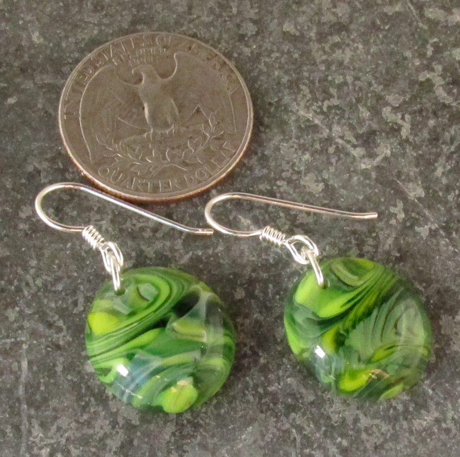 Lime and dark sparkly green meld like dew drops on foliage. Earwires and all other metal findings are sterling silver.