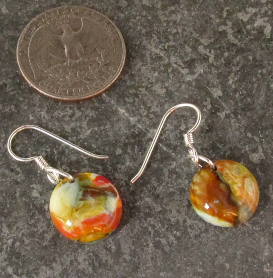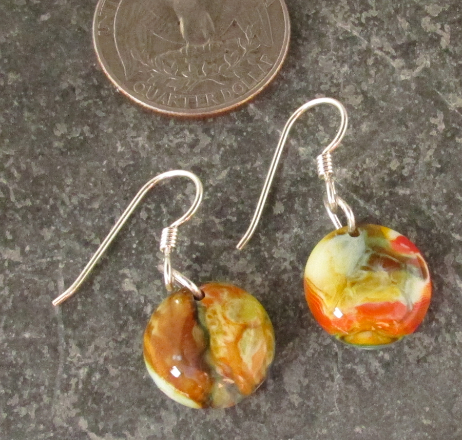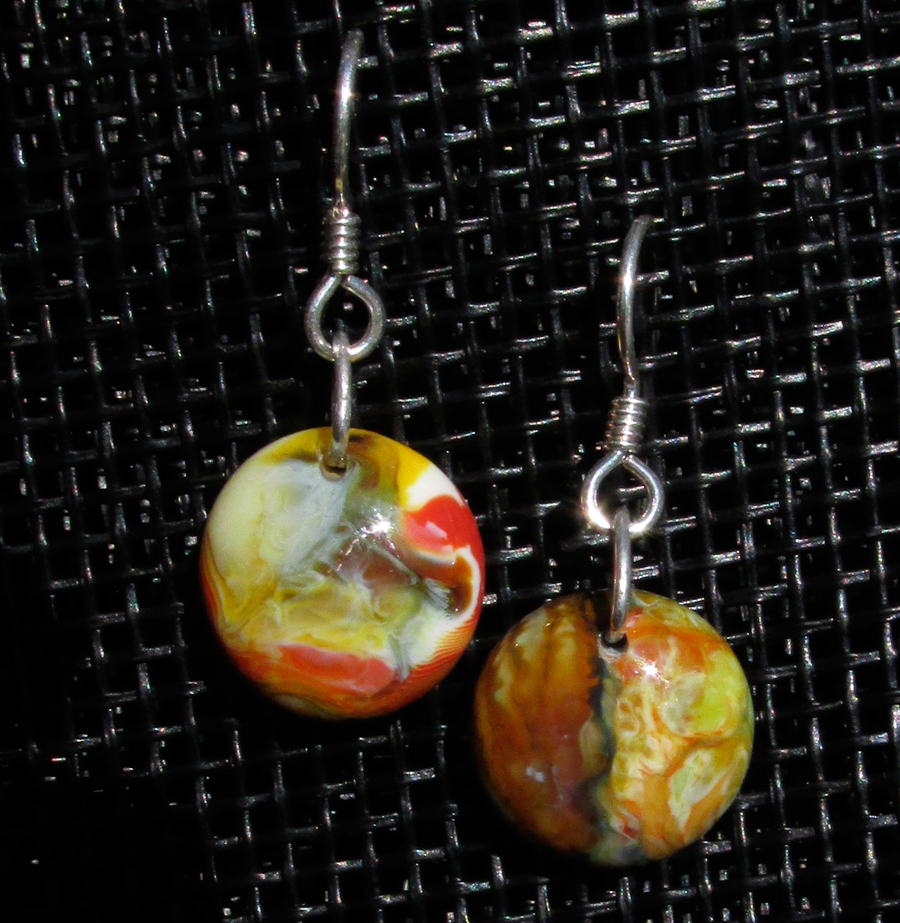 Red, Orange, Yellow, and Blue glass swirl through clouds of ivory. Reminiscent of impressionistic landscapes and satellite photos. Earwires and all other metal findings are sterling silver.
