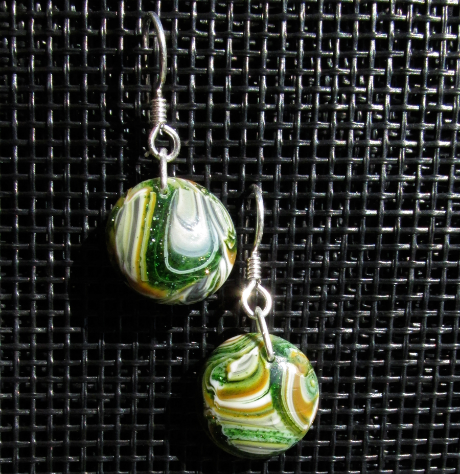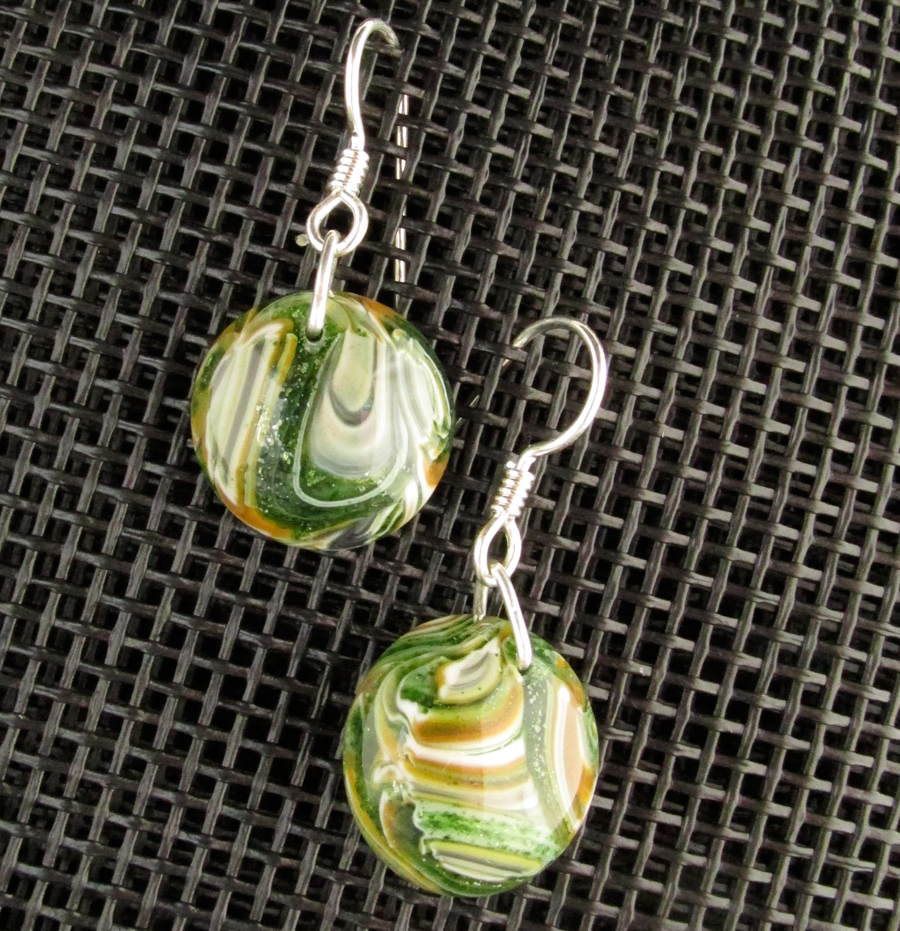 Brown, green, and ivory swirls look great with neutral tones and green. Earwires and all other metal findings are sterling silver.