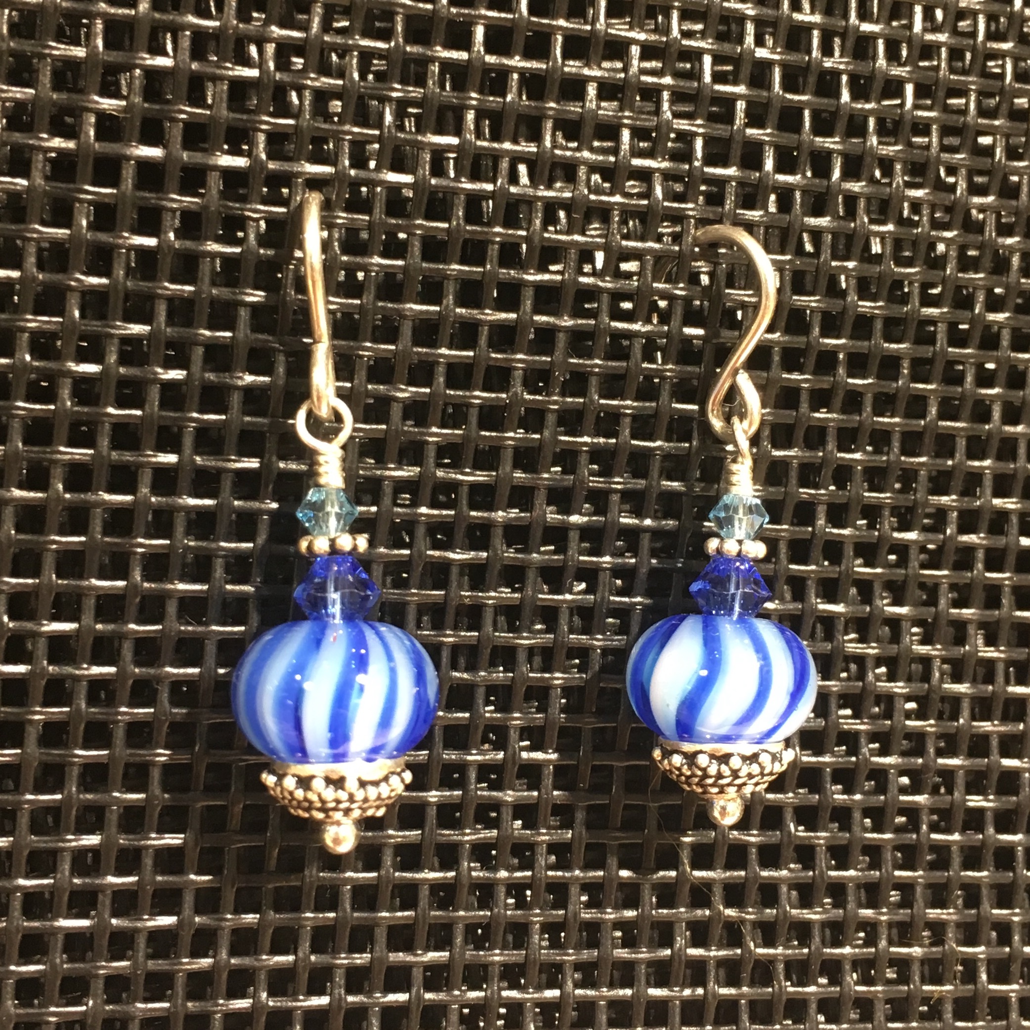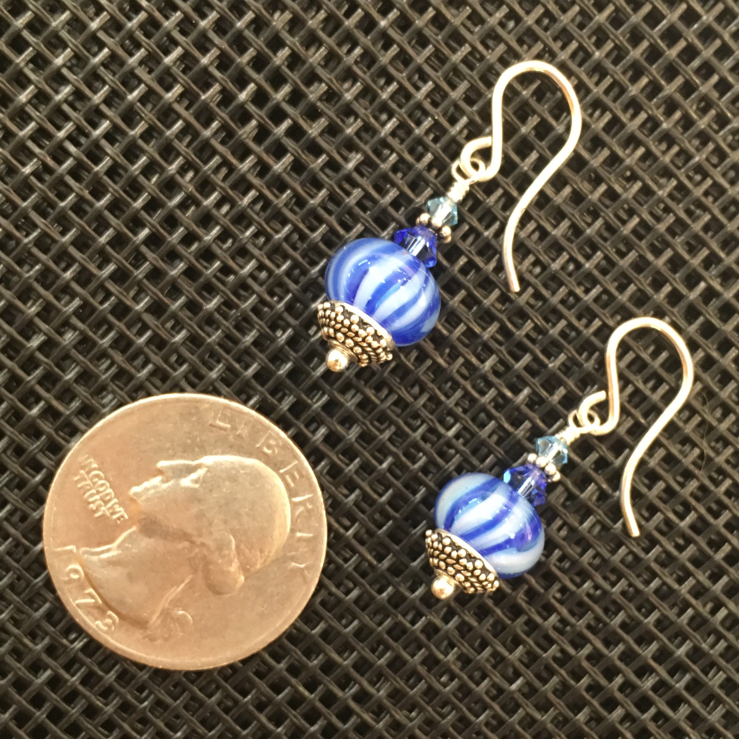 A blue-green spectrum of glass swirls in the depths, reminiscent of glacier ice. Earwires and all other metal findings are sterling silver.
