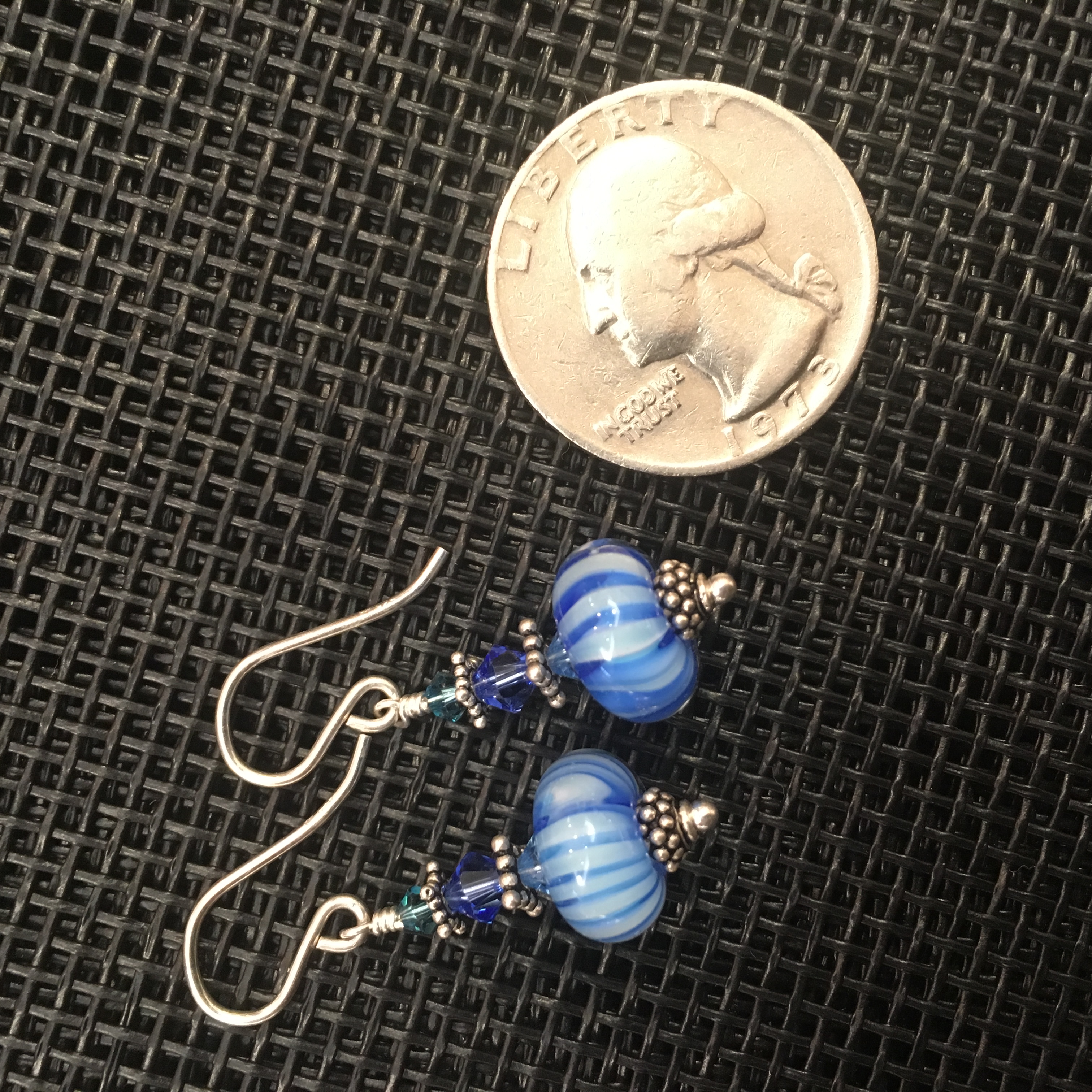 A blue spectrum of glass swirls in the depths, reminiscent of glacier ice. Earwires and all other metal findings are sterling silver.
