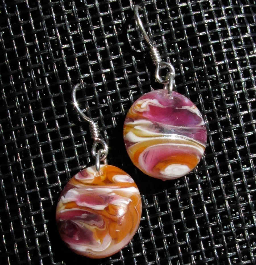 Pink orange, and ivory swirls. This piece also looks great with purples, browns and grays. Works with so much of my wardrobe! Earwires and all other metal findings are sterling silver.