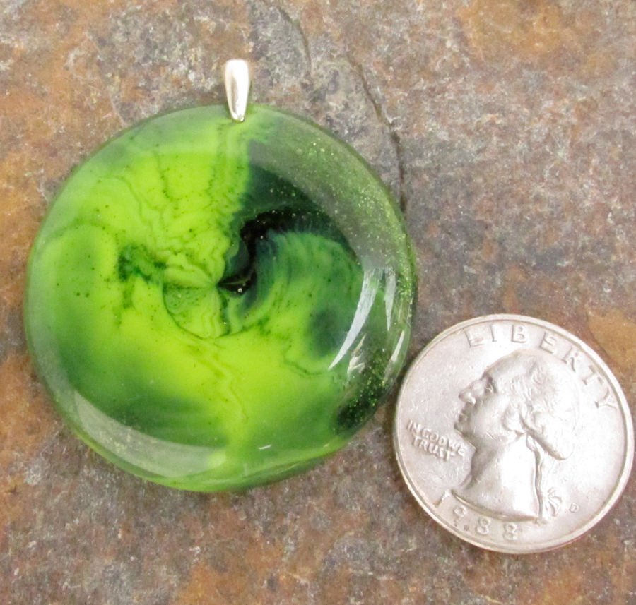 Lime and dark sparkly green meld like dew drops on foliage. All pendants come with a black waxed cotton cord, but check out the silk ribbons for another fun way to wear it. Bail is sterling silver.