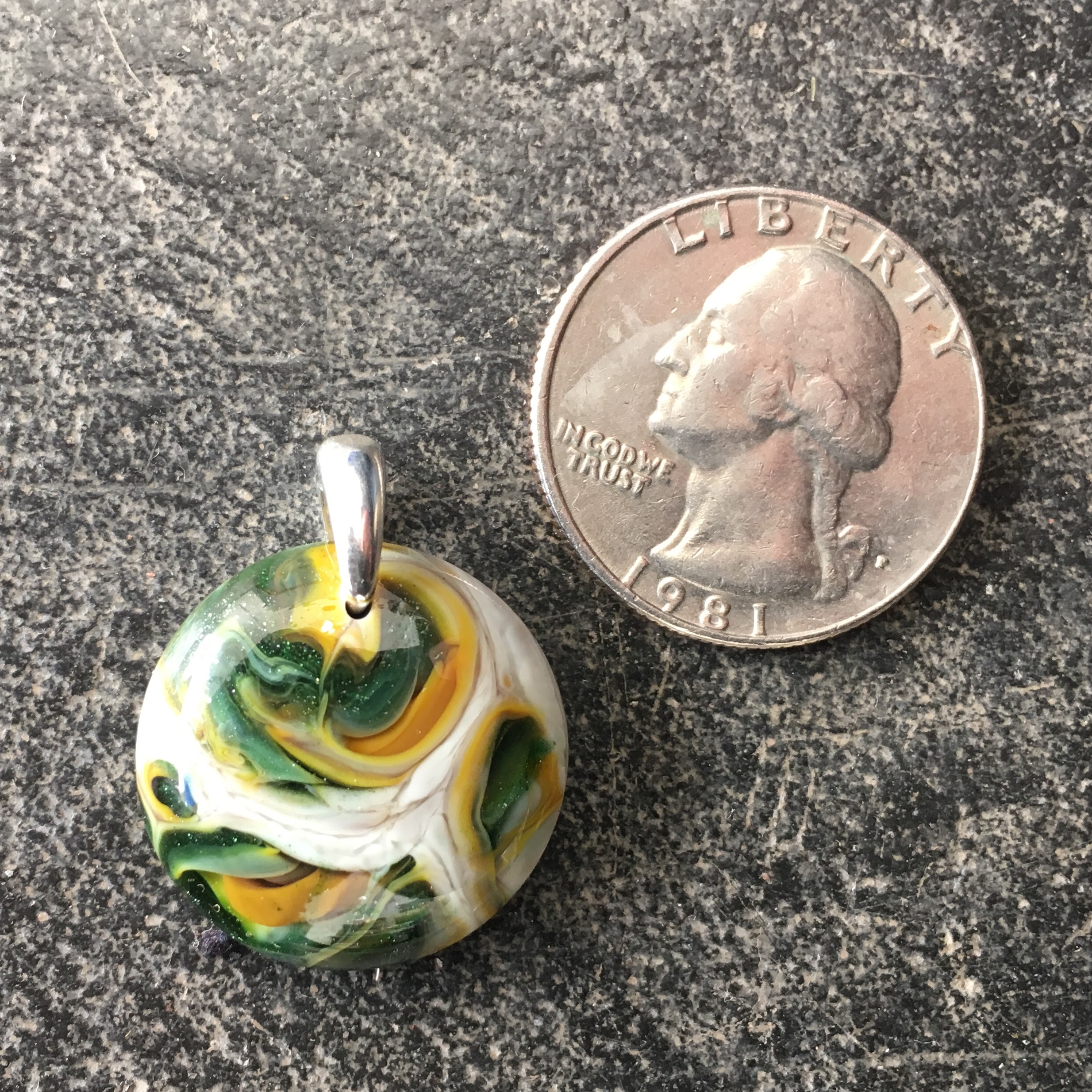 Brown, green, and ivory swirls look great with neutral tones. All pendants come with a black waxed cotton cord, but check out the silk ribbons for another fun way to wear it. Bail is sterling silver.
