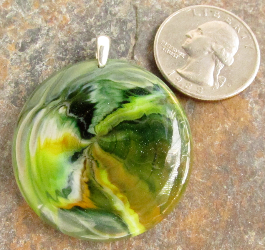 Brown, green, and ivory swirls look great with neutral tones. All pendants come with a black waxed cotton cord, but check out the silk ribbons for another fun way to wear it. Bail is sterling silver.