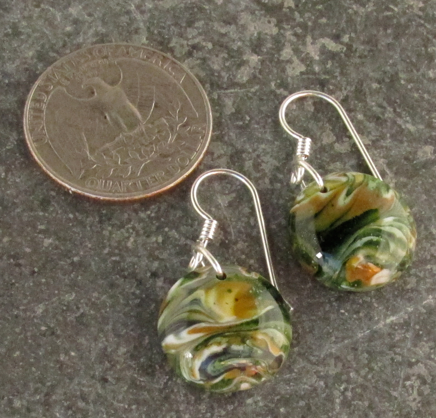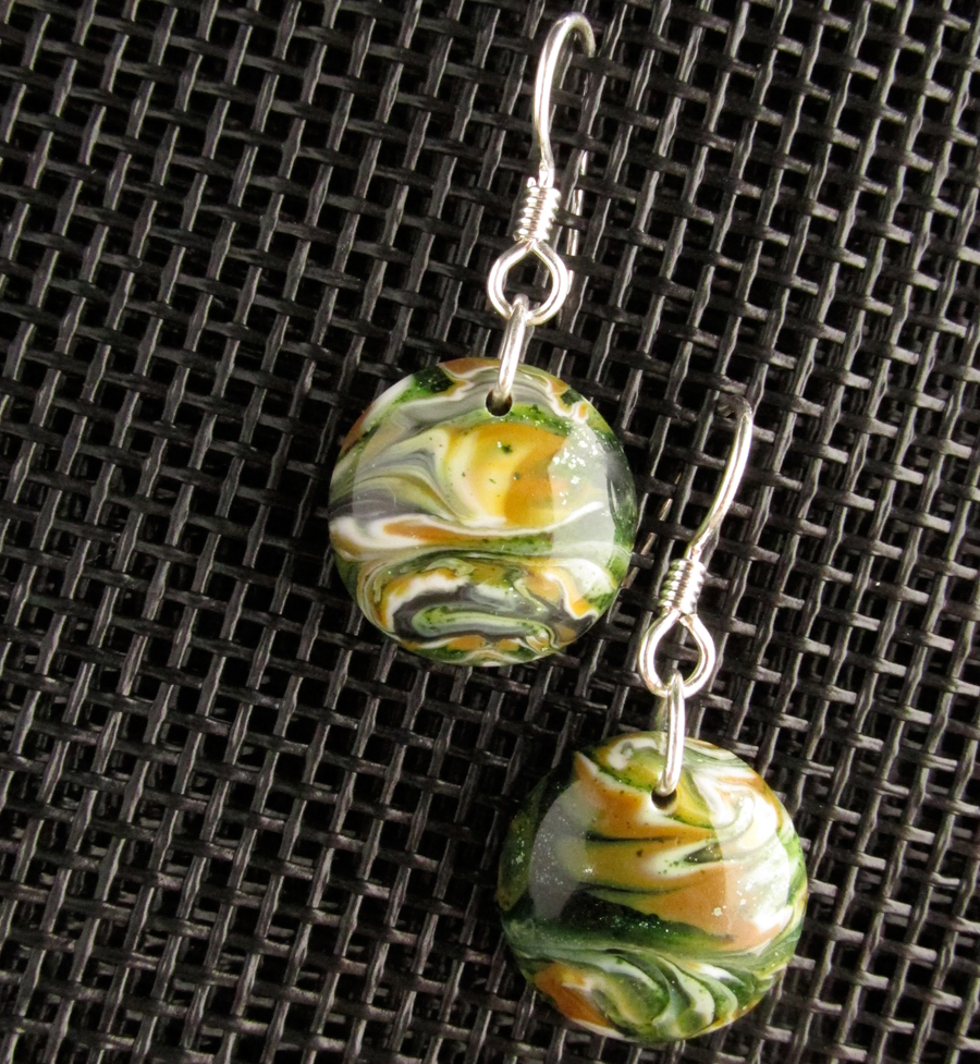 Brown, green, and ivory swirls look great with neutral tones and green. Earwires and all other metal findings are sterling silver.