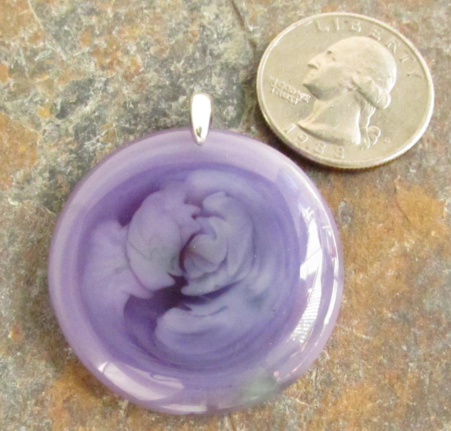Hazy swirls of purple in all its shades and tints. If you love purple, also check out the Lunar Purple collection. All pendants come with a black waxed cotton cord, but check out the silk ribbons for another fun way to wear it. Bail is sterling silver.