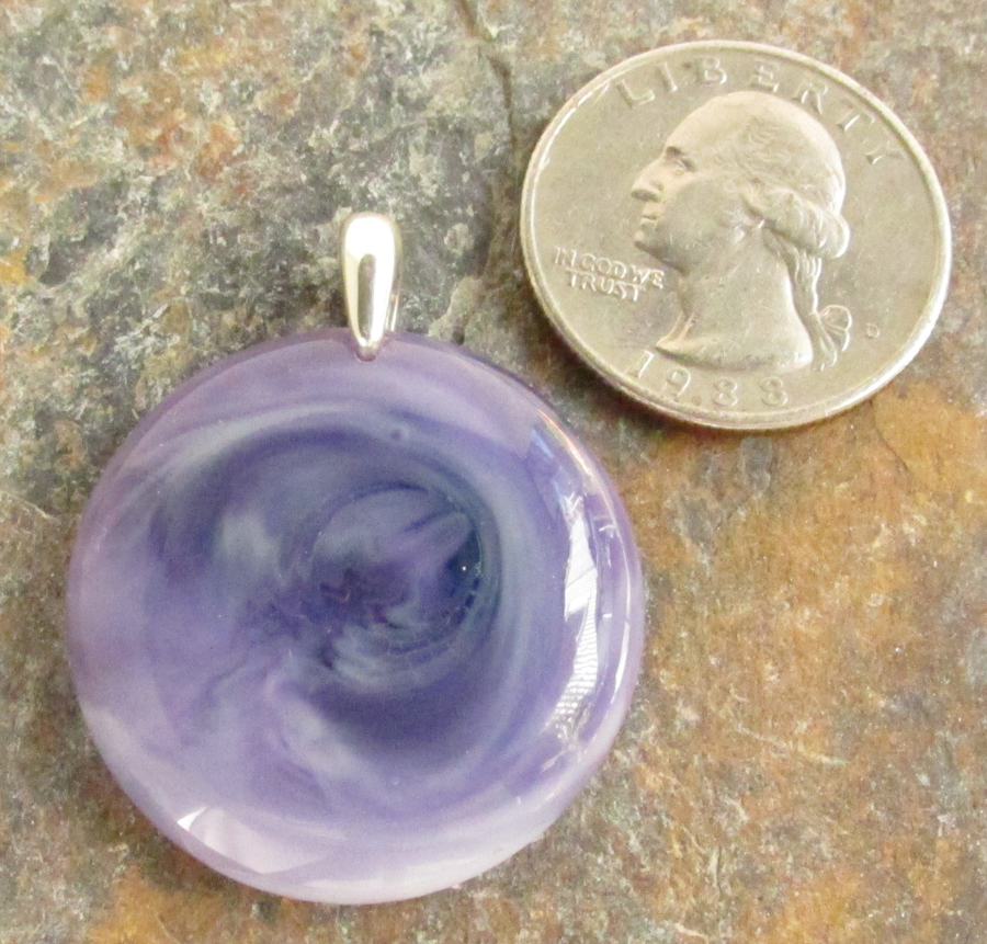 Hazy swirls of purple in all its shades and tints. If you love purple, also check out the Lunar Purple collection. All pendants come with a black waxed cotton cord, but check out the silk ribbons for another fun way to wear it. Bail is sterling silver.