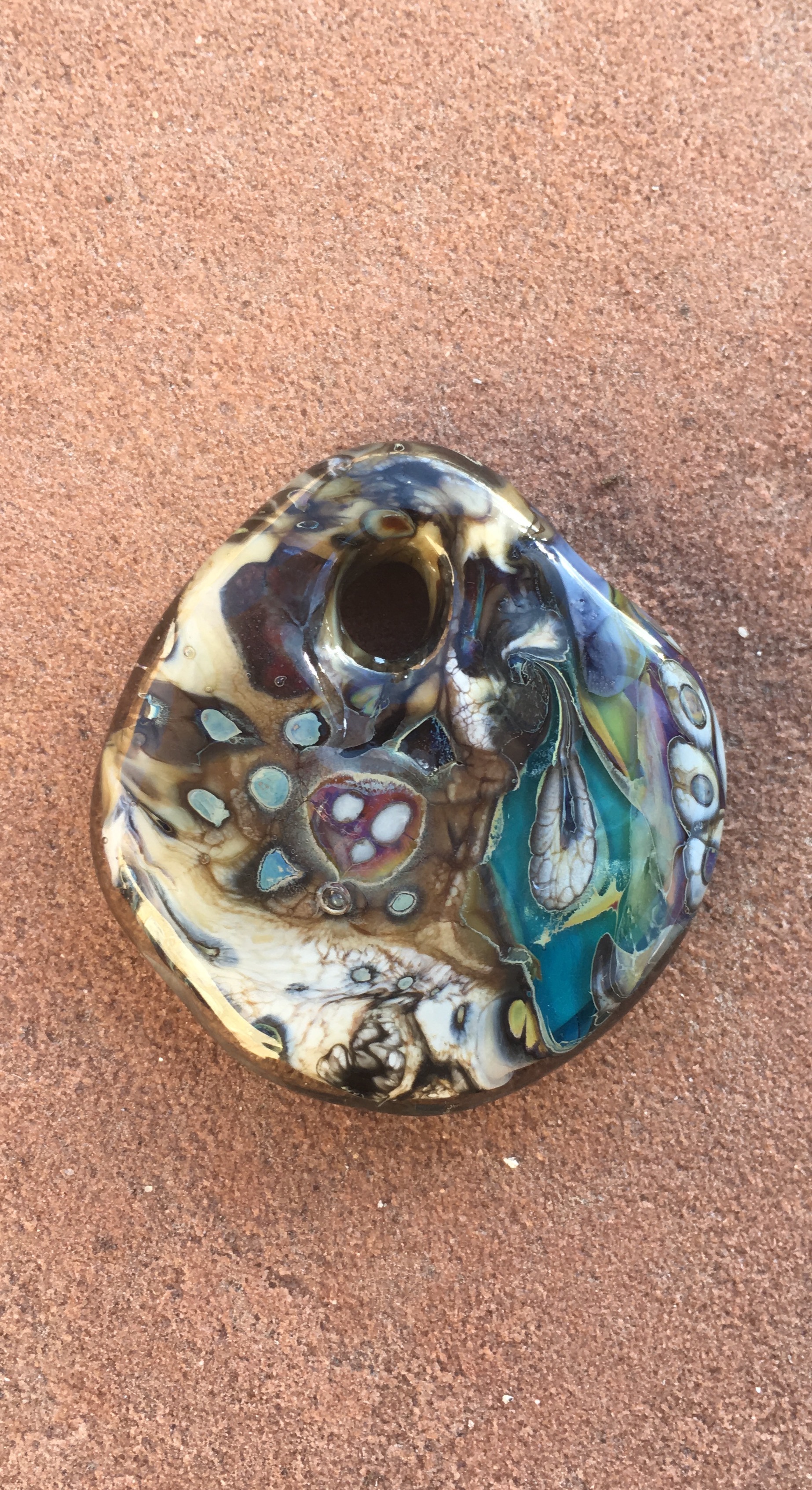 Like having two pendants in one! With exceptional depth and detail, this pendant was made in a torch flame from shattered scraps of glass on my workbench. Comes with a black waxed cotton cord. Can be worn either side out.