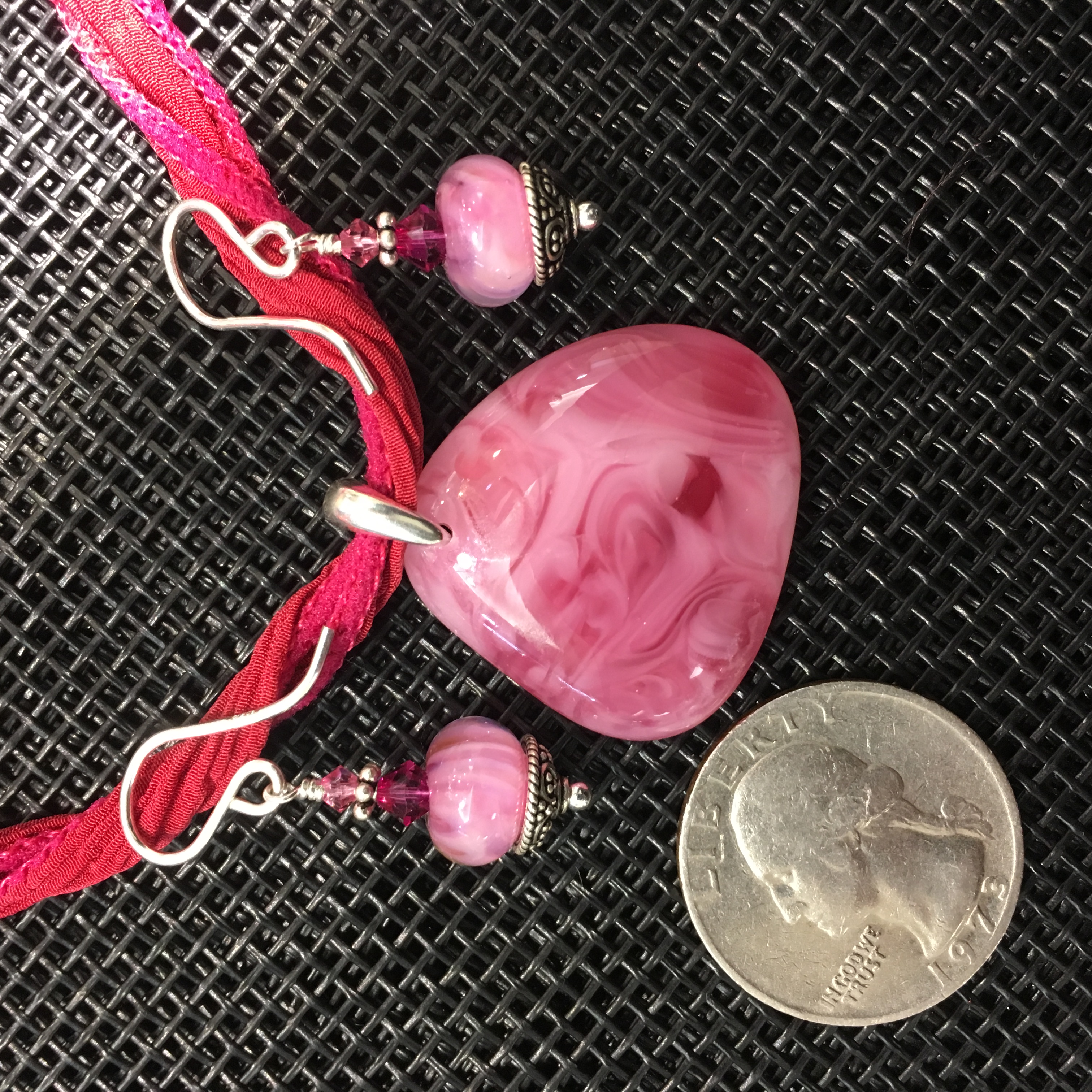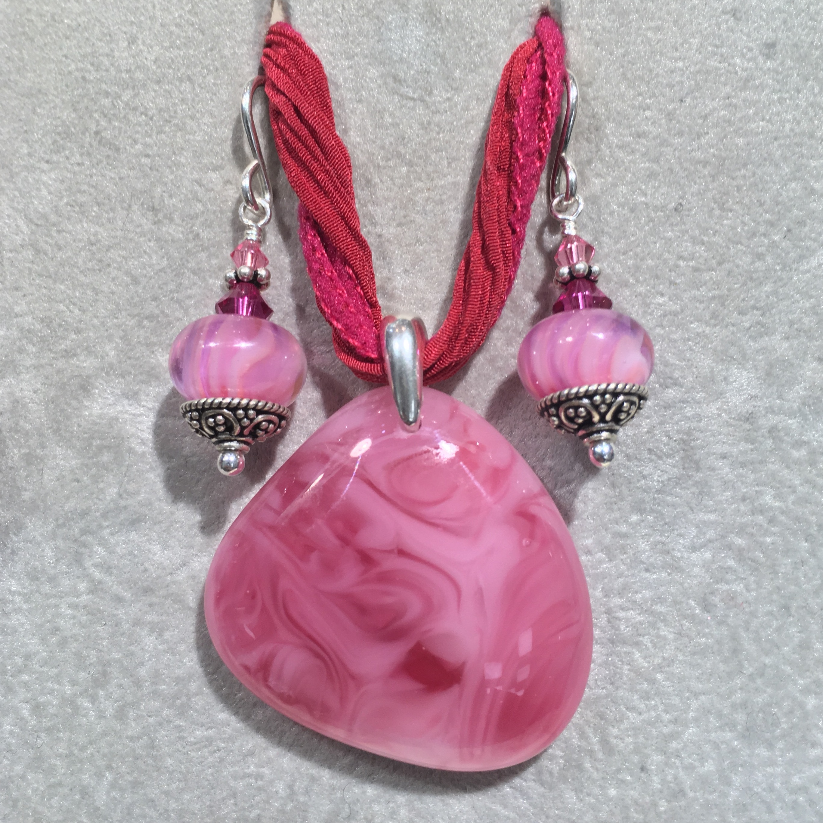 Pink! With a matching silk ribbon. Earwires and all other metal findings are sterling silver.