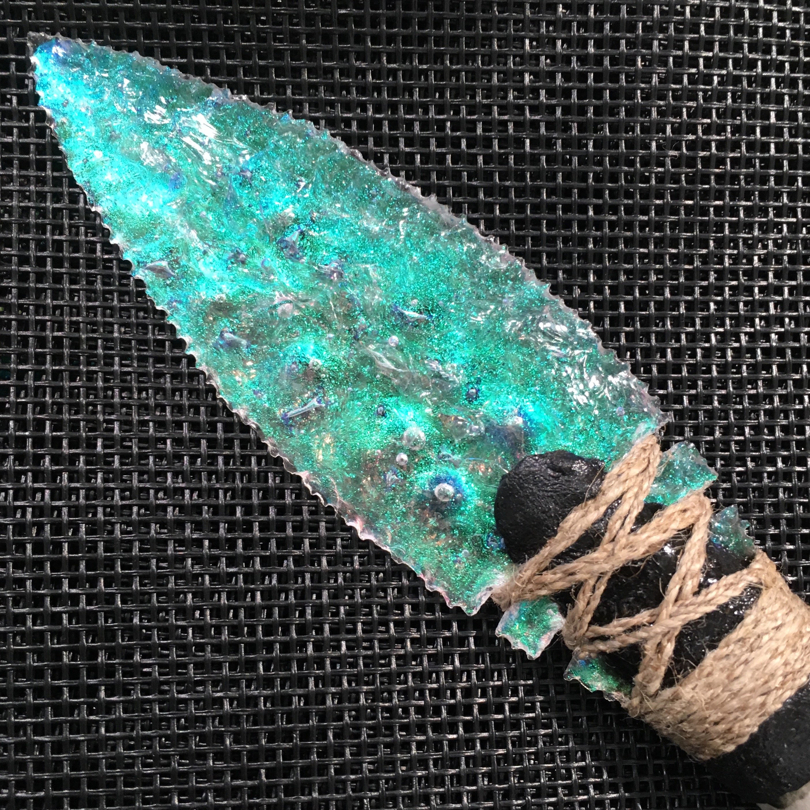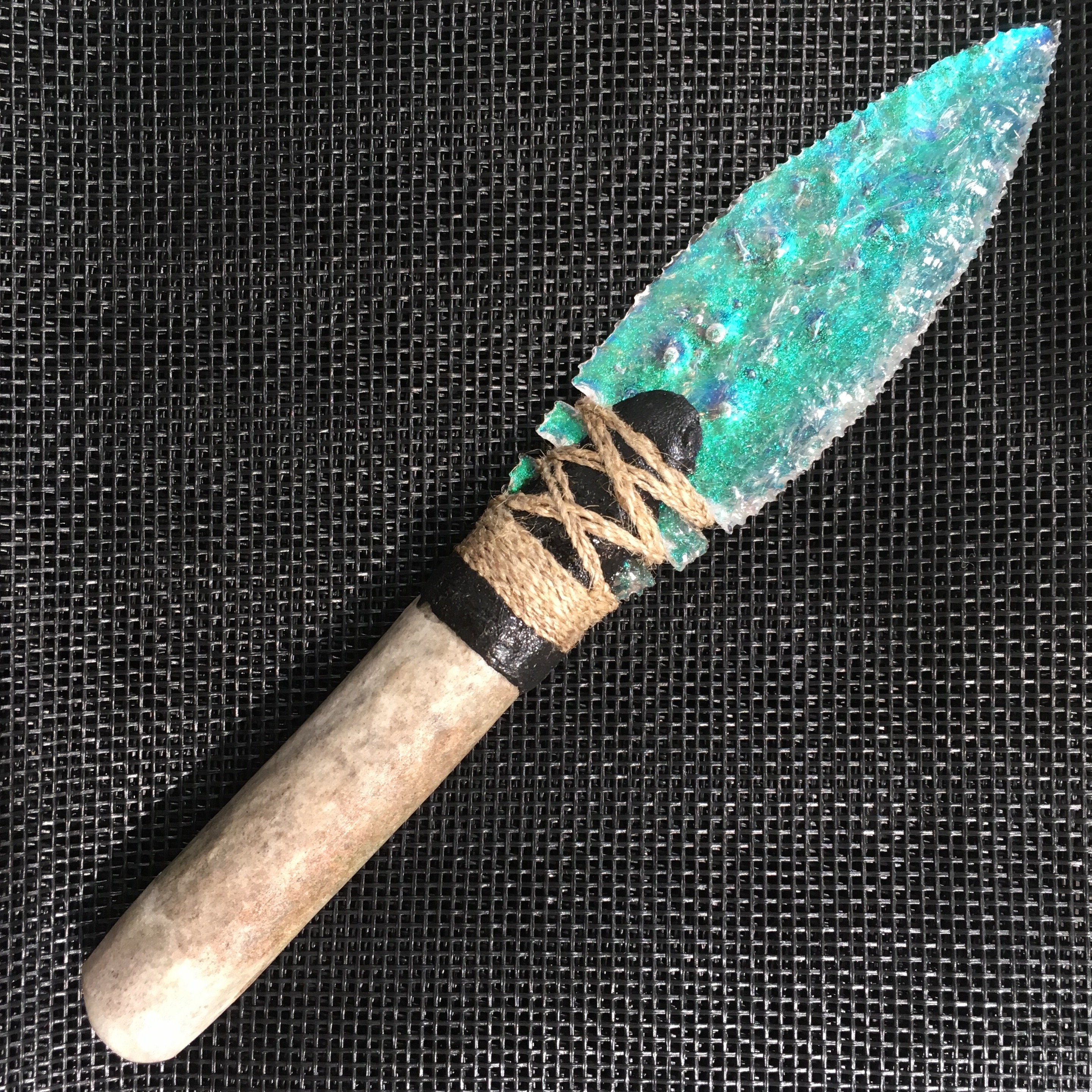 Green, teal, and pink shift mysteriously inside layers of clear glass. On a black background, the reflected green colors dominate; against white, the transmitted pink tones come out. Fused glass chipped into a blade using ancient techniques. Hafted using pitch glue and hand-spun nettle fibers on a shed caribou antler handle. Comes with an antler wedge stand and certificate signed by the artists. Glass by Sara Chatfield, knapping and hafting by Brian Schuch.