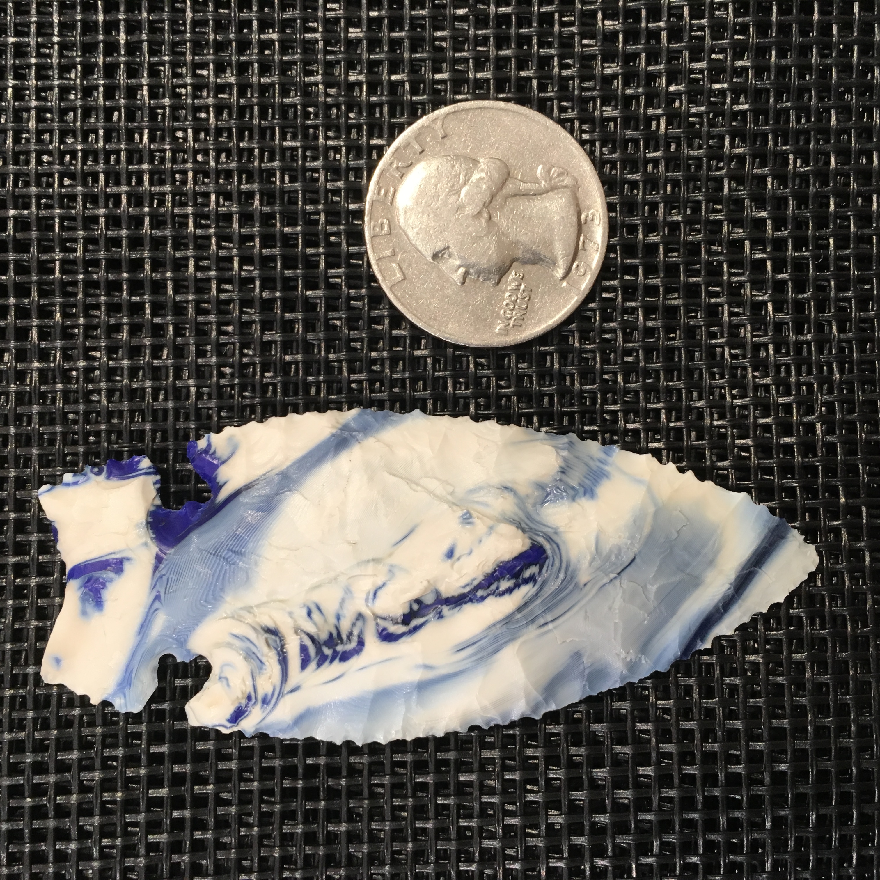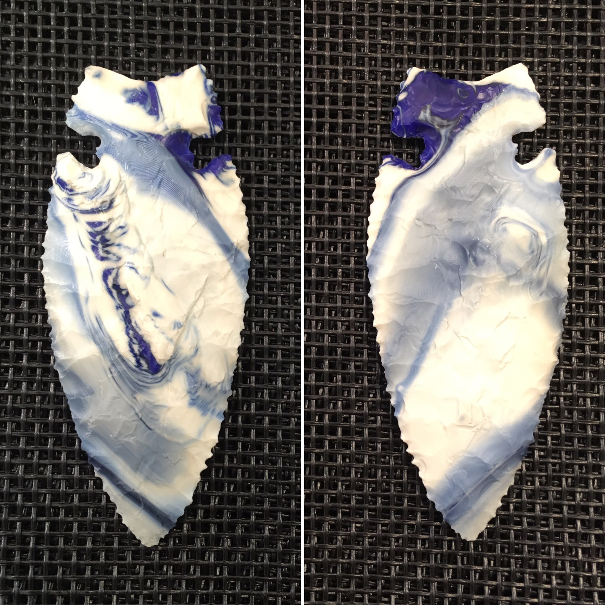 Opaque ivory and dark blue colored glass fused chipped into a blade using ancient techniques. Comes with a certificate signed by the artists. Glass by Sara Chatfield, knapping by Brian Schuch.