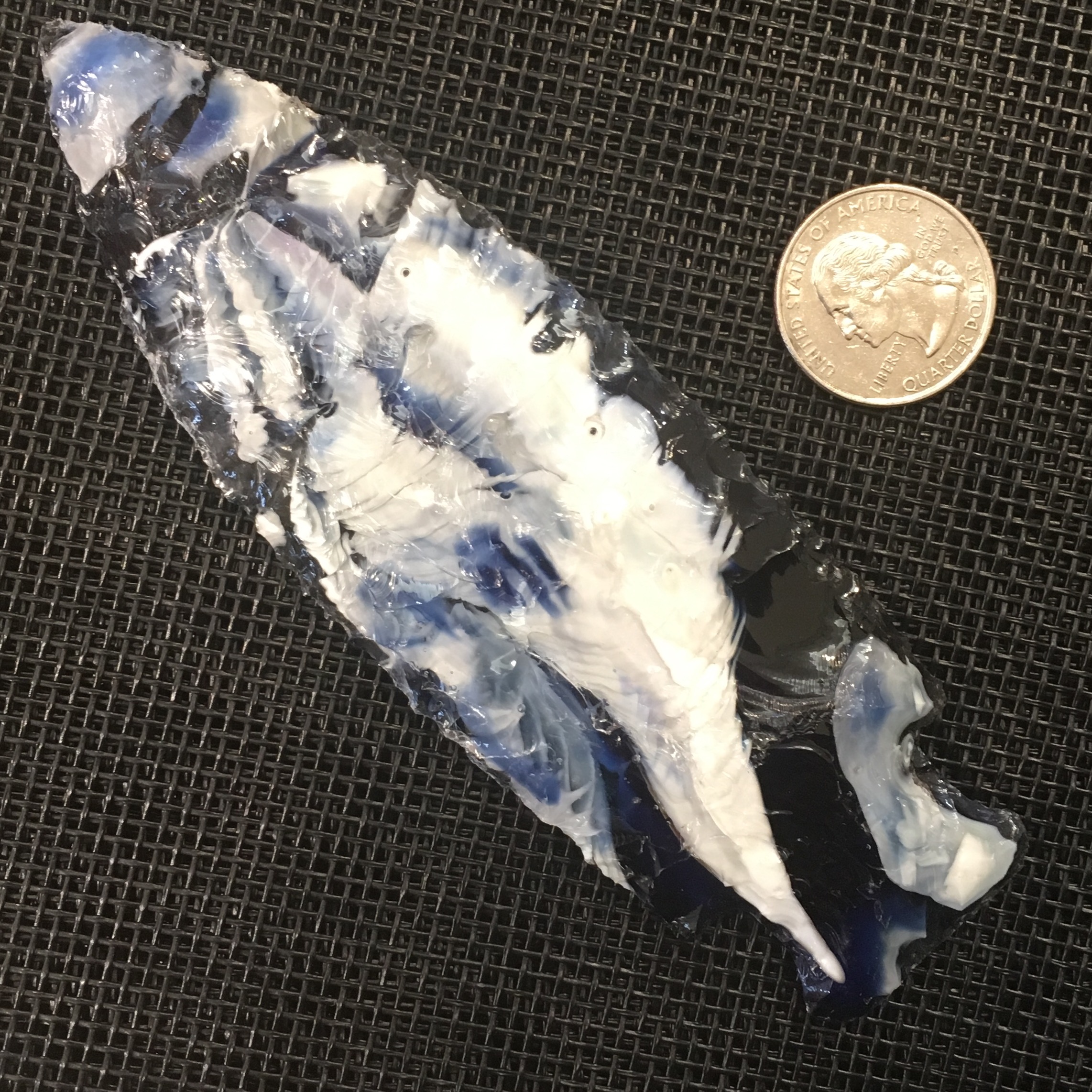 Opaque ivory and transparent dark blue colored glass fused and chipped into a blade using ancient techniques. Comes with a certificate signed by the artists. Glass by Sara Chatfield, knapping by Brian Schuch.