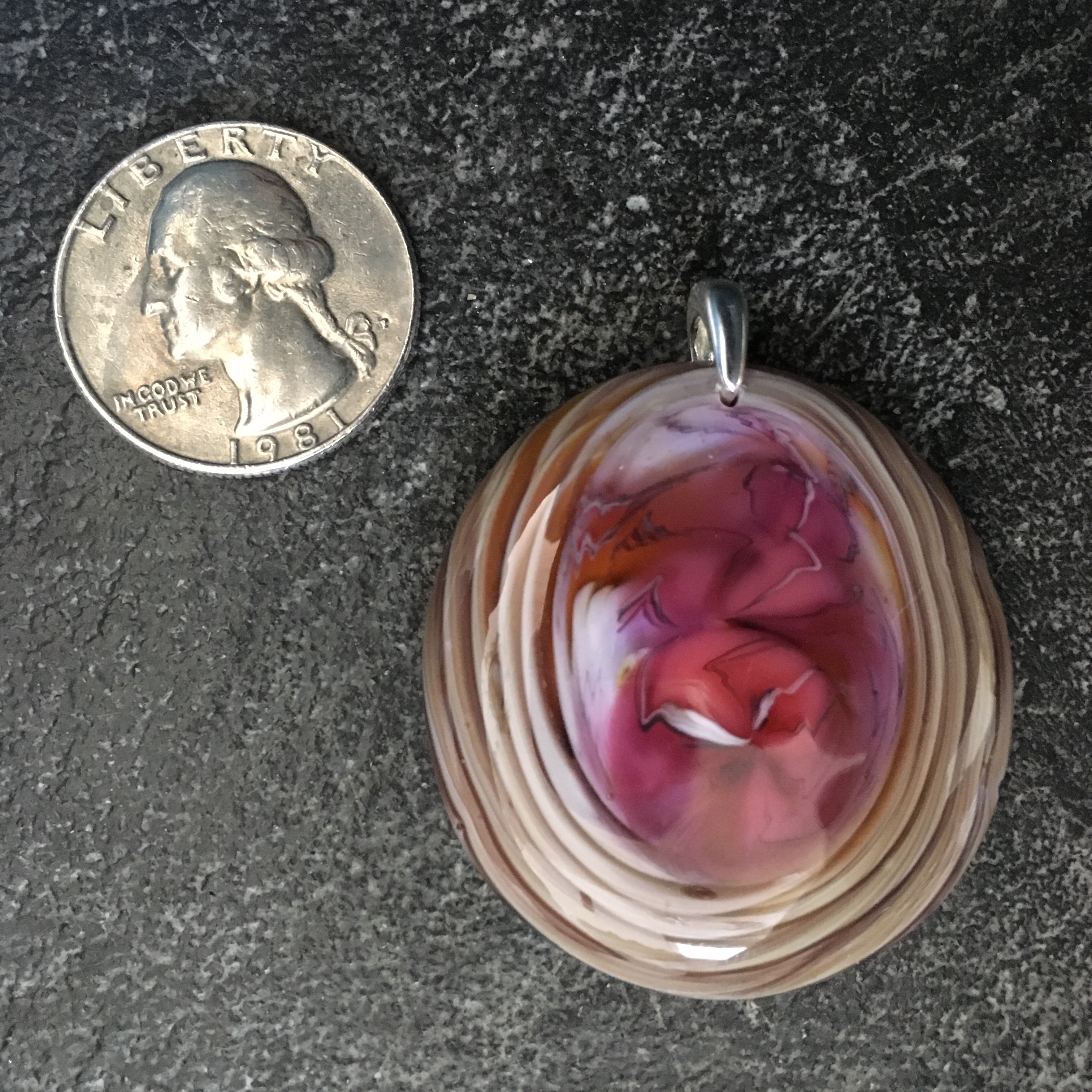 Pink orange, and ivory swirls. This piece also looks great with purples, browns and grays. Works with so much of my wardrobe! All pendants come with a black waxed cotton cord, but check out the silk ribbons for another fun way to wear them. Bail is sterling silver.