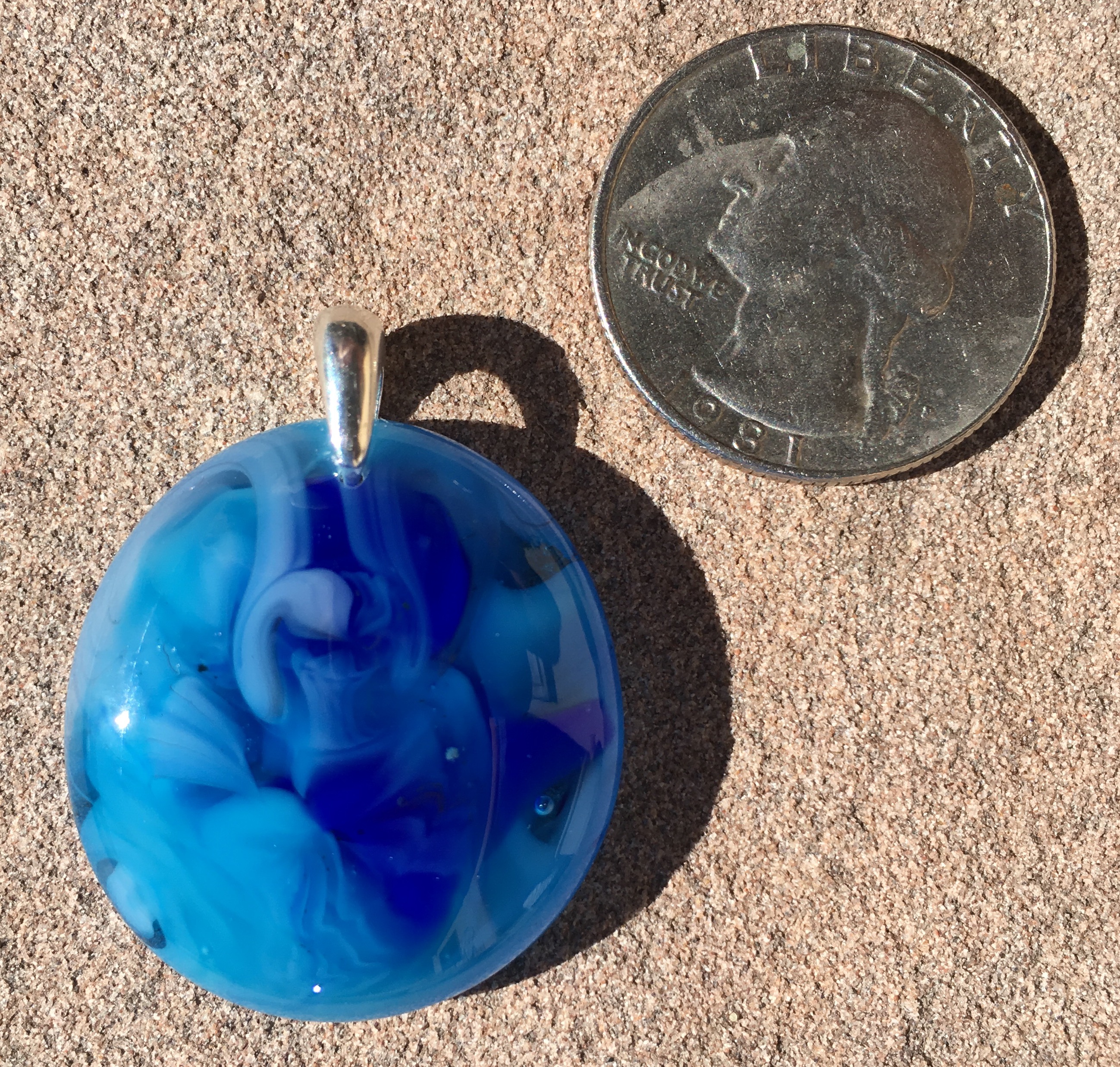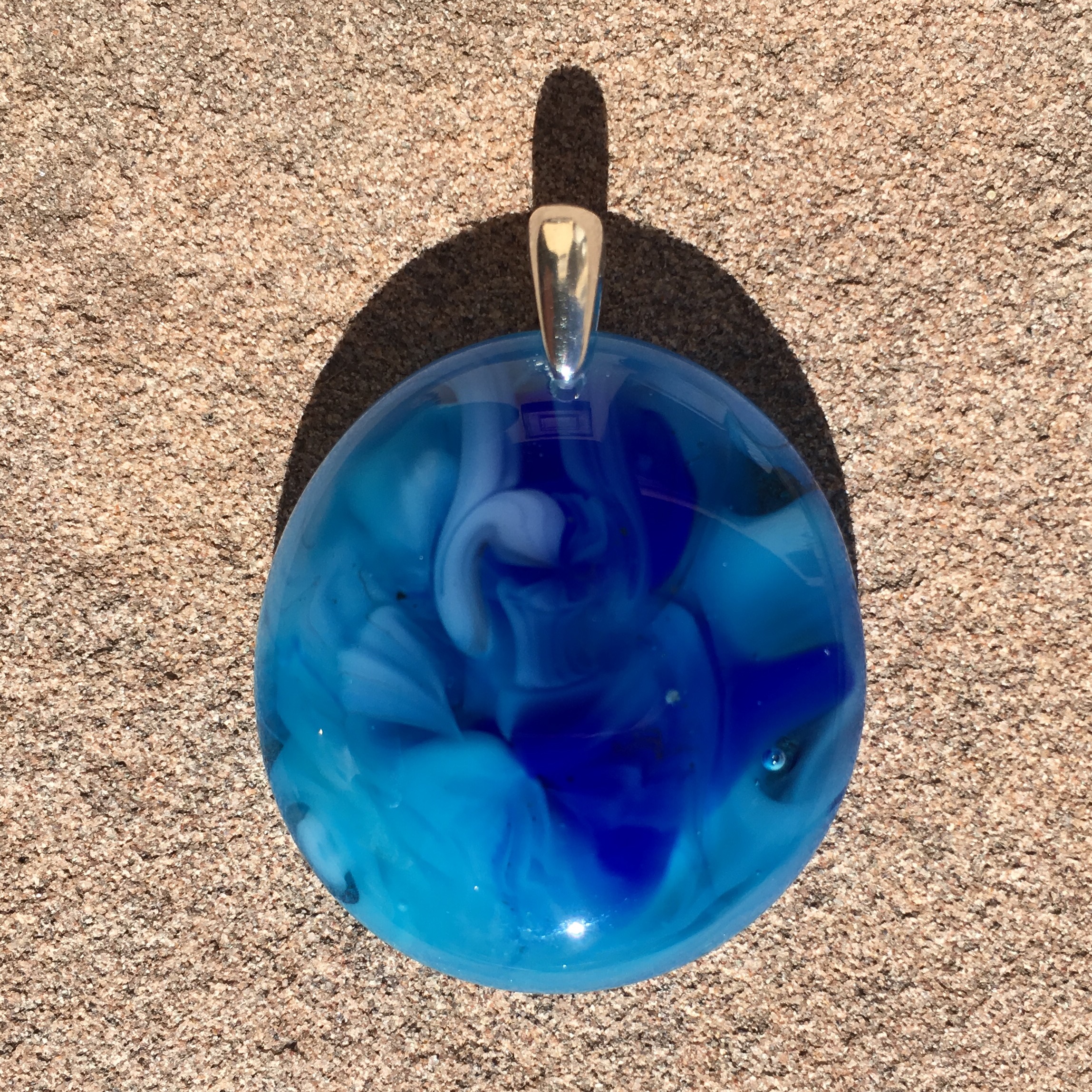 A blue spectrum of glass swirls in the depths, reminiscent of glacier ice. All pendants come with a black waxed cotton cord, but check out the silk ribbons for another fun way to wear it. Bail is sterling silver.