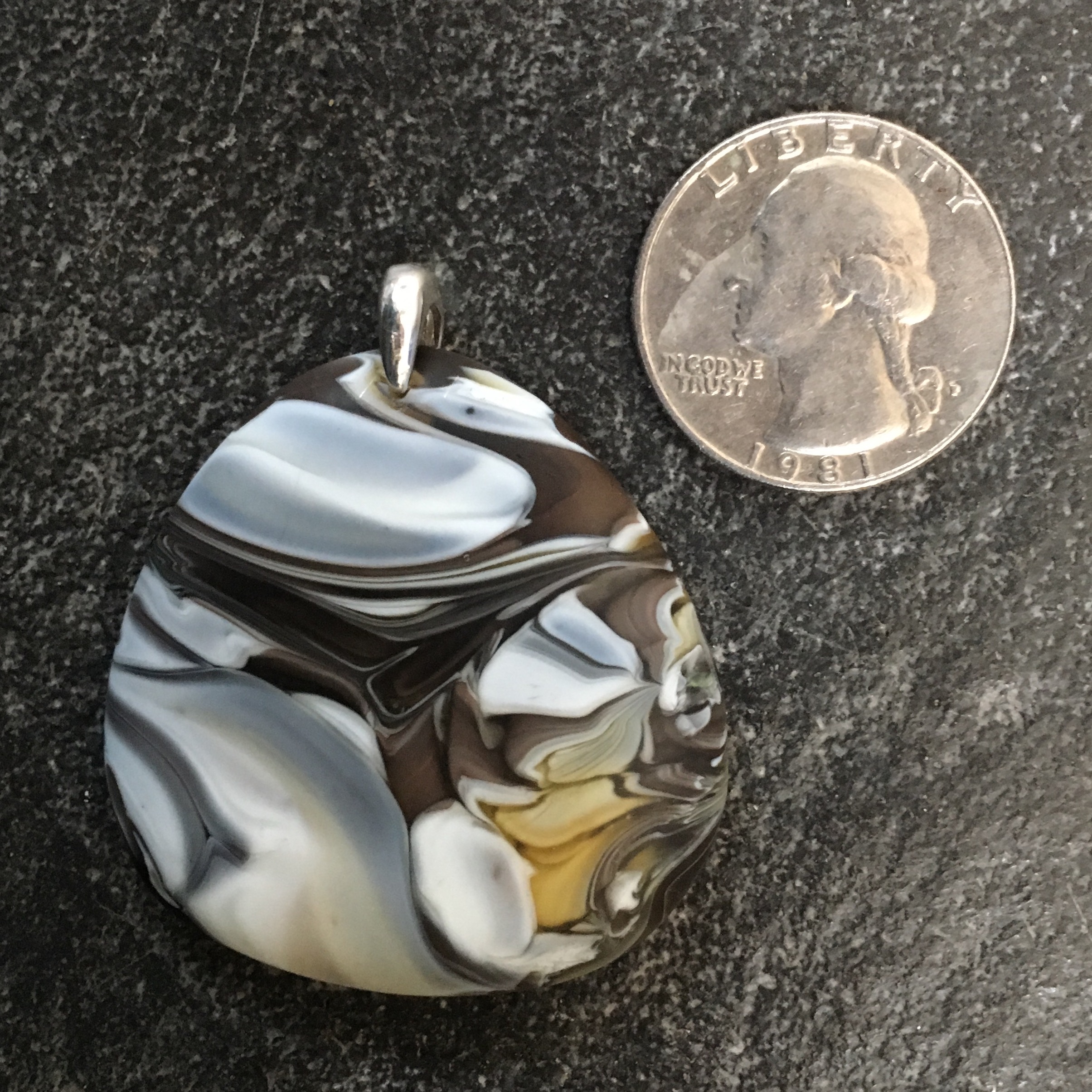 Brown and ivory swirls are versatile with many wardrobes. This one has a texture like beach glass instead of shiny high polish. All pendants come with a black waxed cotton cord, but check out the silk ribbons for another fun way to wear them. Bail is sterling silver.