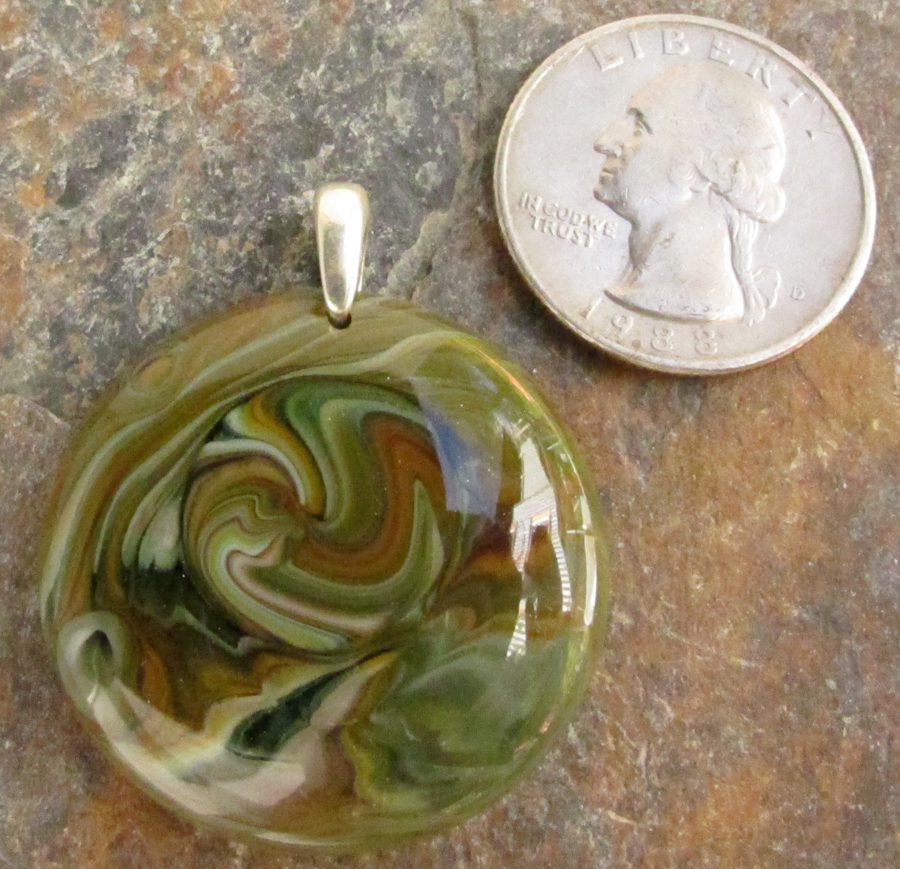 Brown, green, and ivory swirls look great with neutral tones. All pendants come with a black waxed cotton cord, but check out the silk ribbons for another fun way to wear it. Bail is sterling silver.