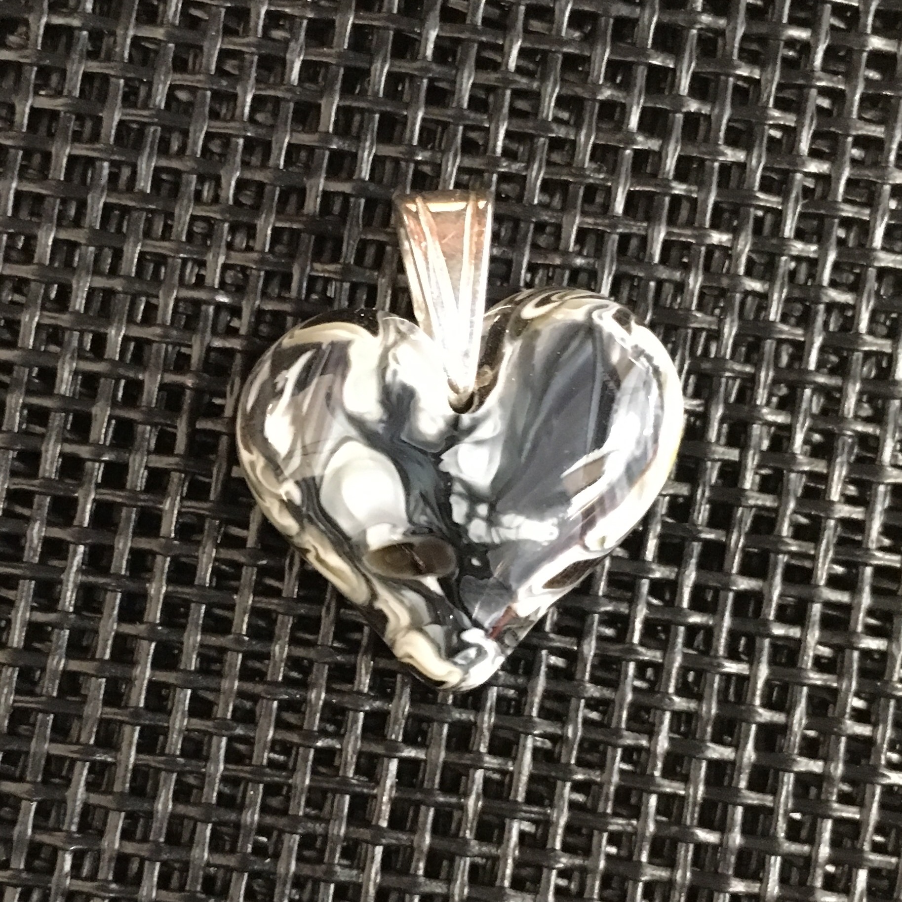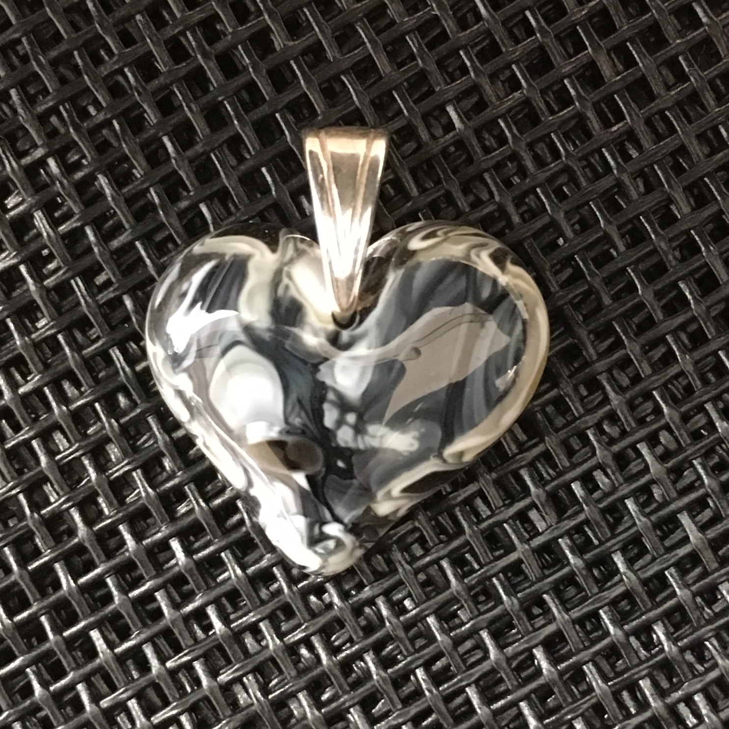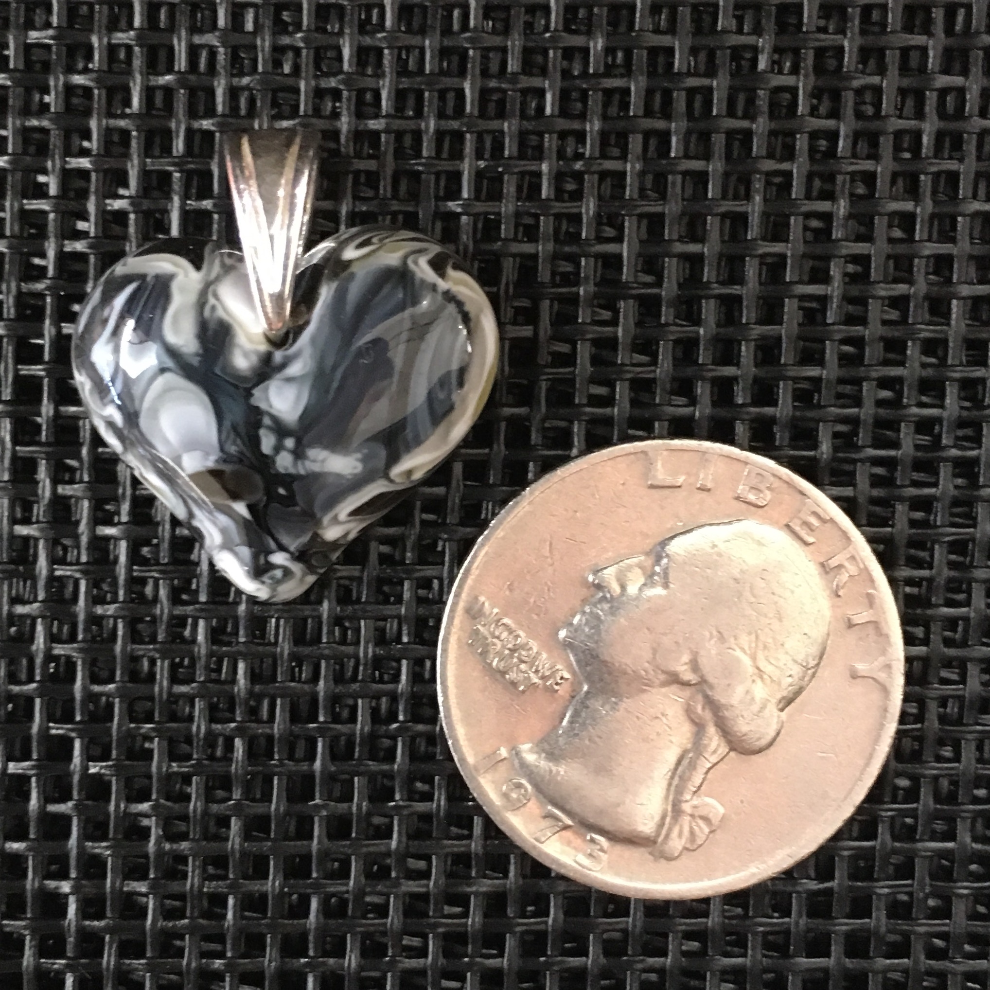 Black and white swirls match everything! All pendants come with a black waxed cotton cord, but check out the silk ribbons for another fun way to wear it. Bail is sterling silver.