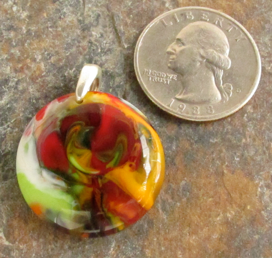 Red, Orange, Yellow, Green and Blue glass swirl through clouds of ivory. Reminiscent of impressionistic landscapes and satellite photos. All pendants come with a black waxed cotton cord, but check out the silk ribbons for another fun way to wear it. Bail is sterling silver.