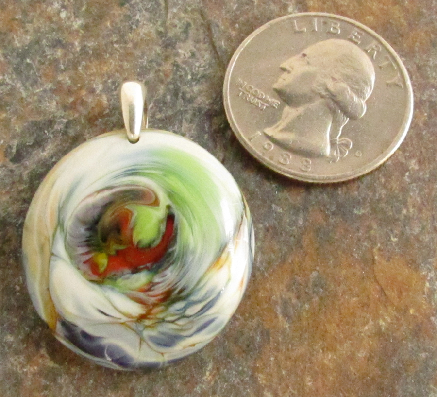 Red, Orange, Yellow, Green and Blue glass swirl through clouds of ivory. Reminiscent of impressionistic landscapes and satellite photos. All pendants come with a black waxed cotton cord, but check out the silk ribbons for another fun way to wear it. Bail is sterling silver.