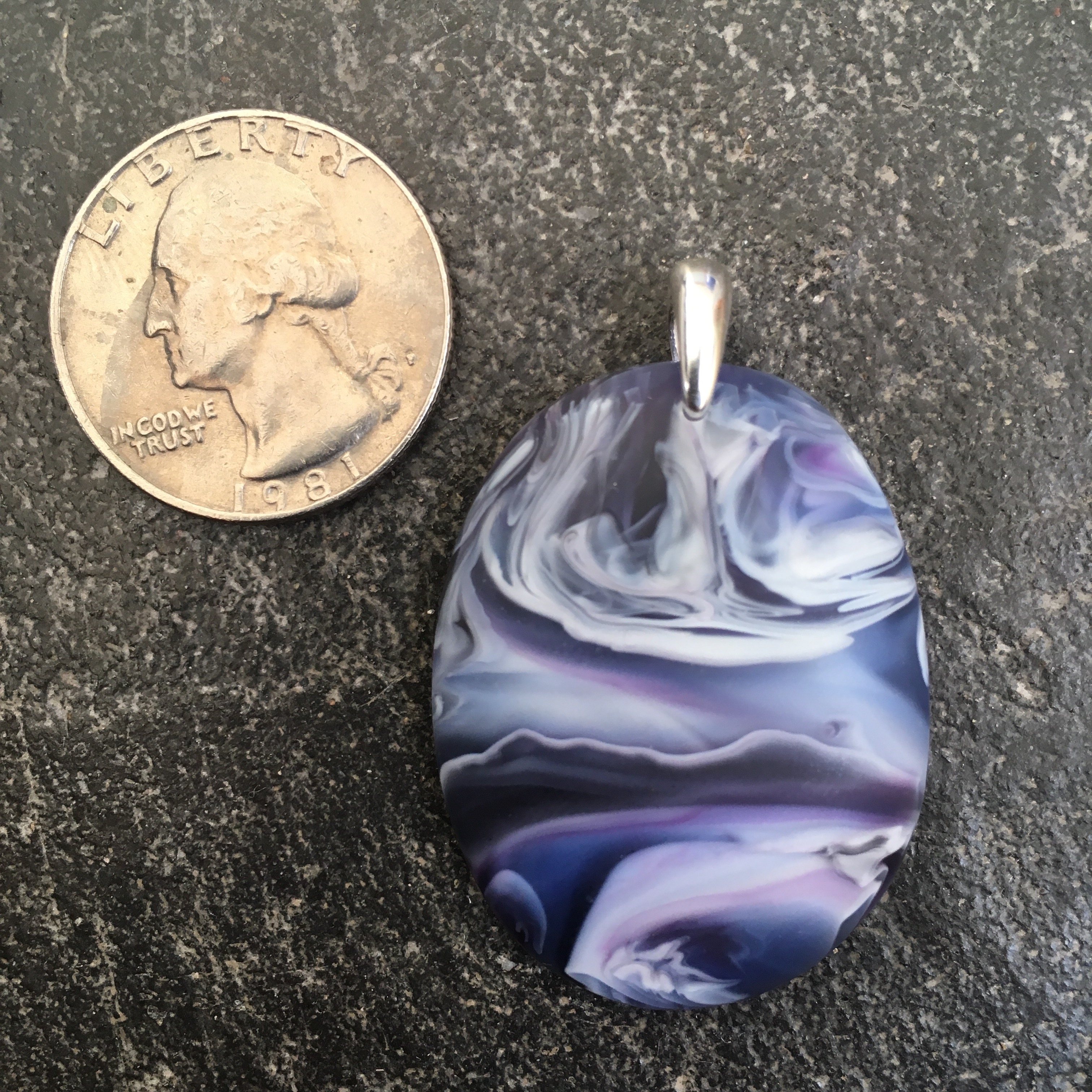 Transparent purple and blue swirl with opaque ivory glass. This color scheme often has the best visual depth. This pendant has been tumbled to achieve a texture like beach glass. All pendants come with a black waxed cotton cord, but check out the silk ribbons for another fun way to wear it. Bail is sterling silver.