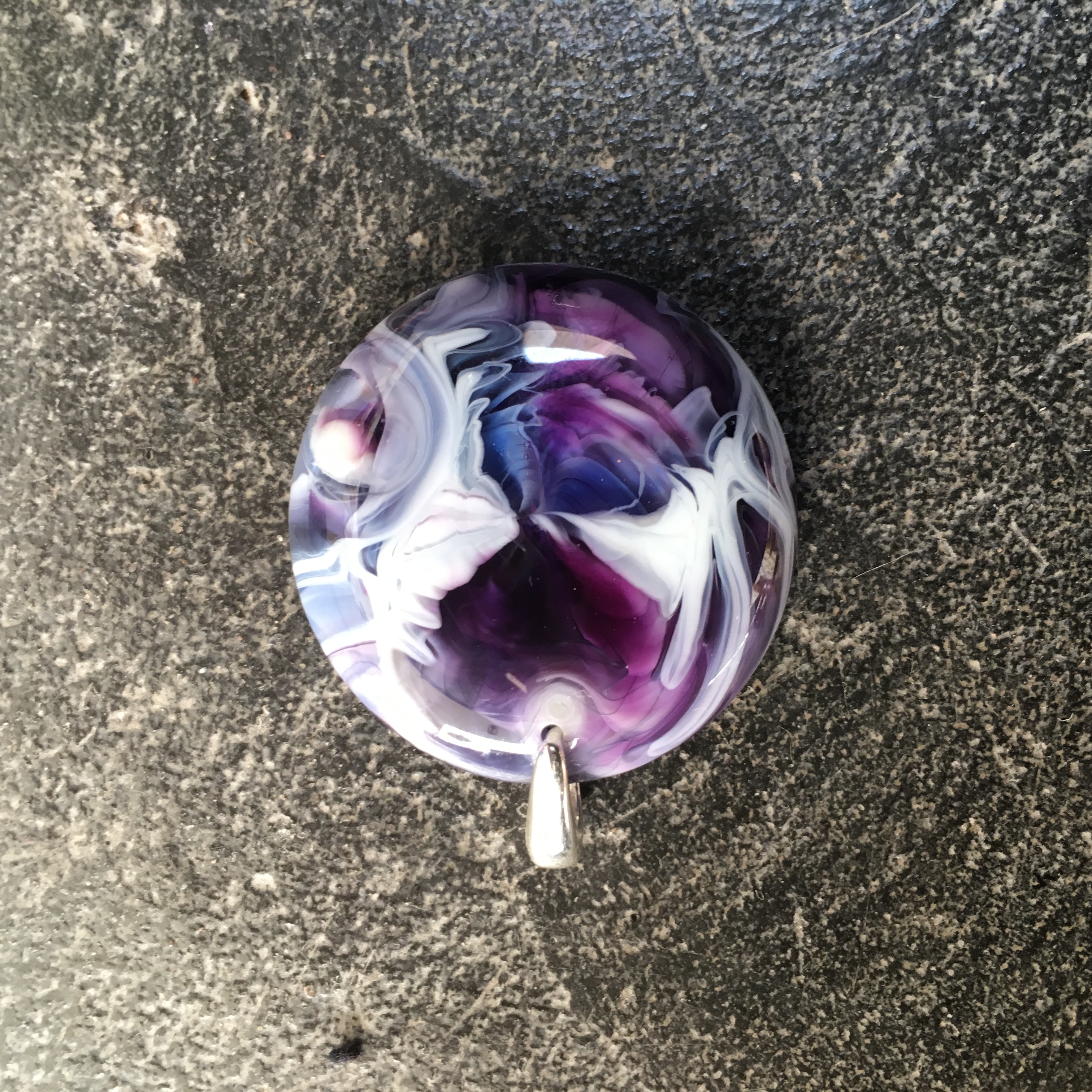 Transparent purple and blue swirl with opaque ivory glass. This color scheme often has the best visual depth. All pendants come with a black waxed cotton cord, but check out the silk ribbons for another fun way to wear it. Bail is sterling silver.