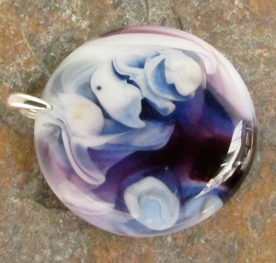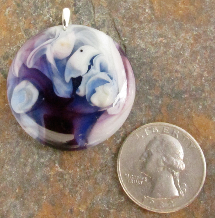 Transparent purple and blue swirl with opaque ivory glass. This color scheme often has the best visual depth. All pendants come with a black waxed cotton cord, but check out the silk ribbons for another fun way to wear it. Bail is sterling silver.