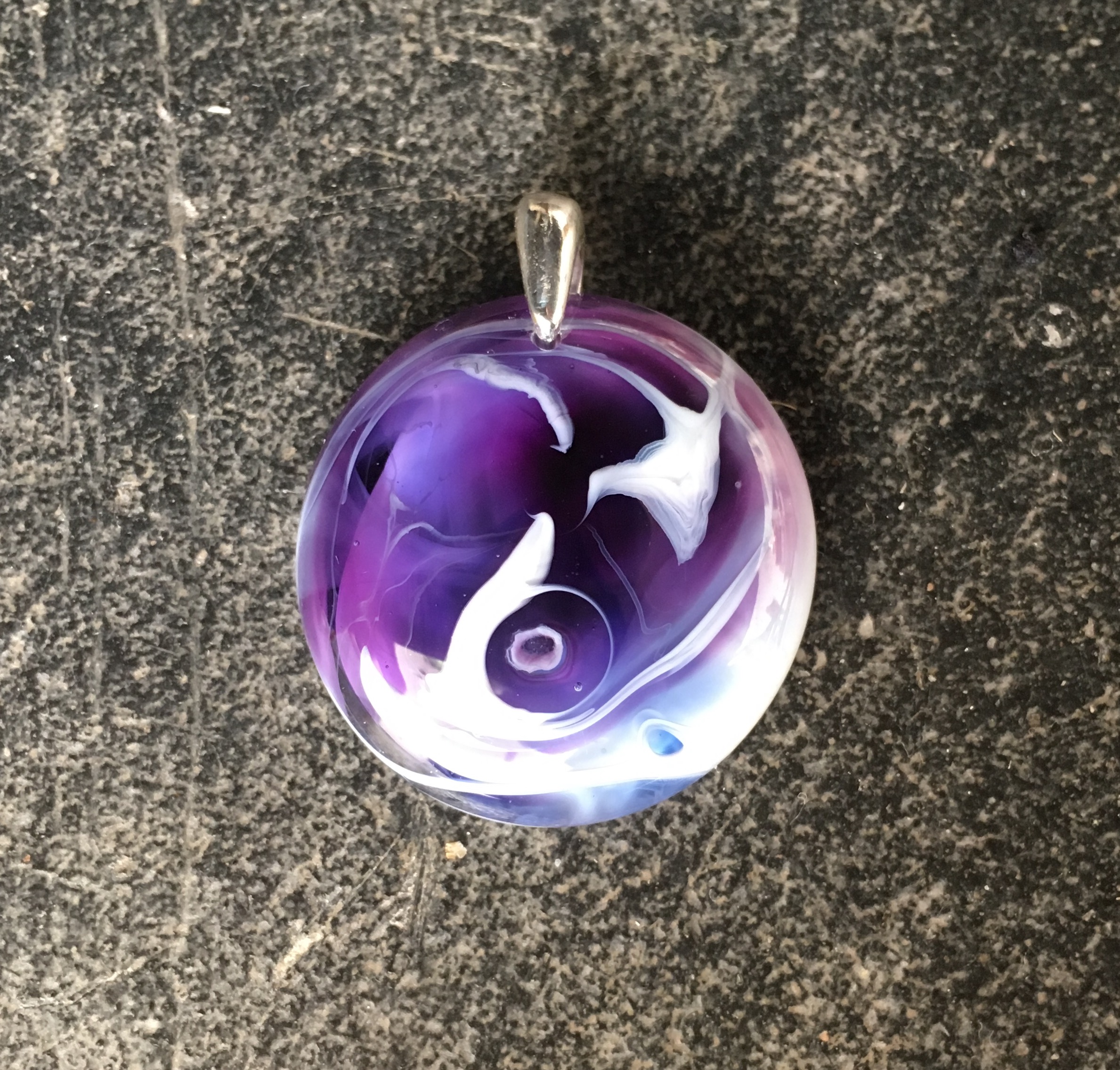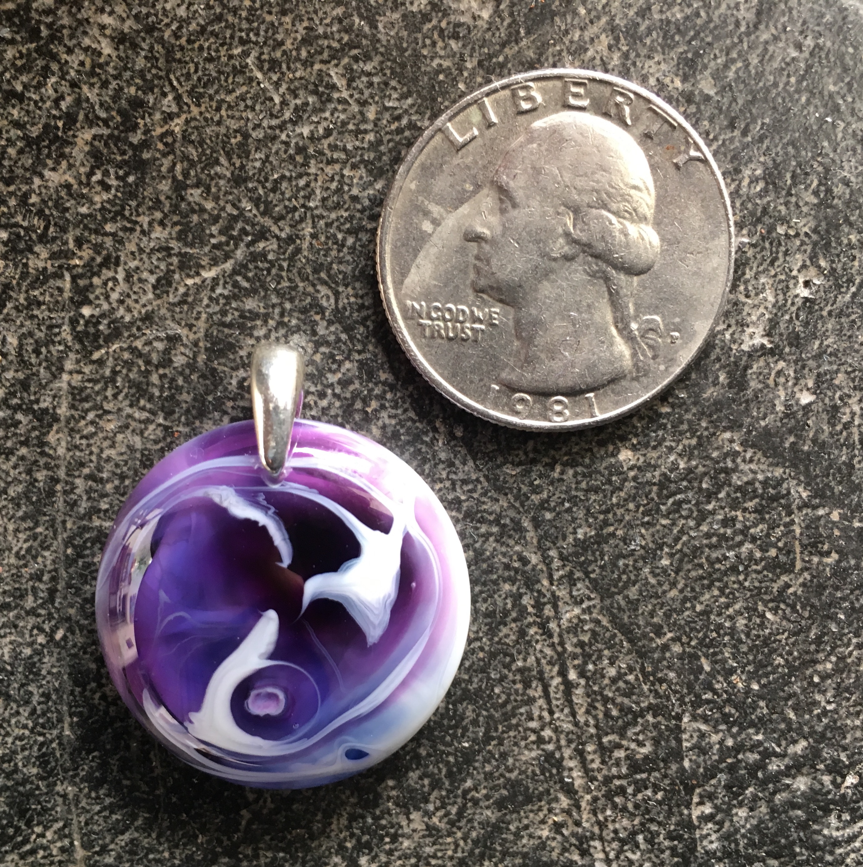 Transparent purple and blue swirl with opaque ivory glass. This color scheme often has the best visual depth. All pendants come with a black waxed cotton cord, but check out the silk ribbons for another fun way to wear them. Bail is sterling silver.