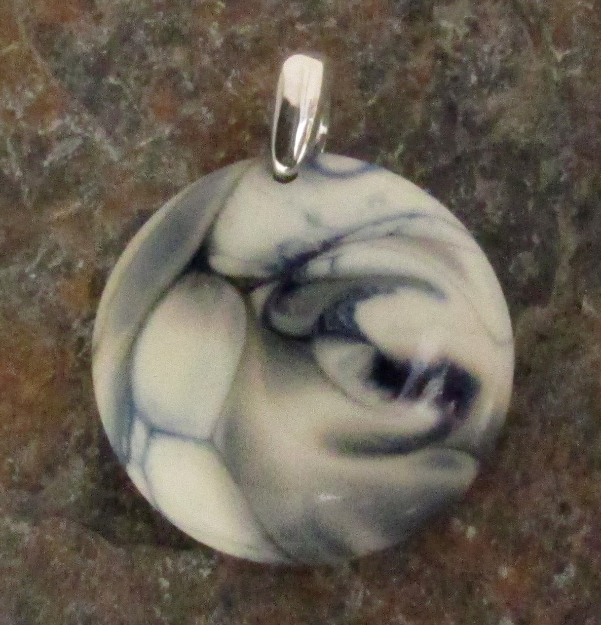 Navy blue and ivory glass swirl and fade, creating curious landscapes and satellite images. All pendants come with a black waxed cotton cord, but check out the silk ribbons for another fun way to wear it. Bail is sterling silver.