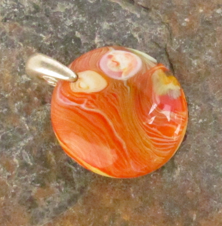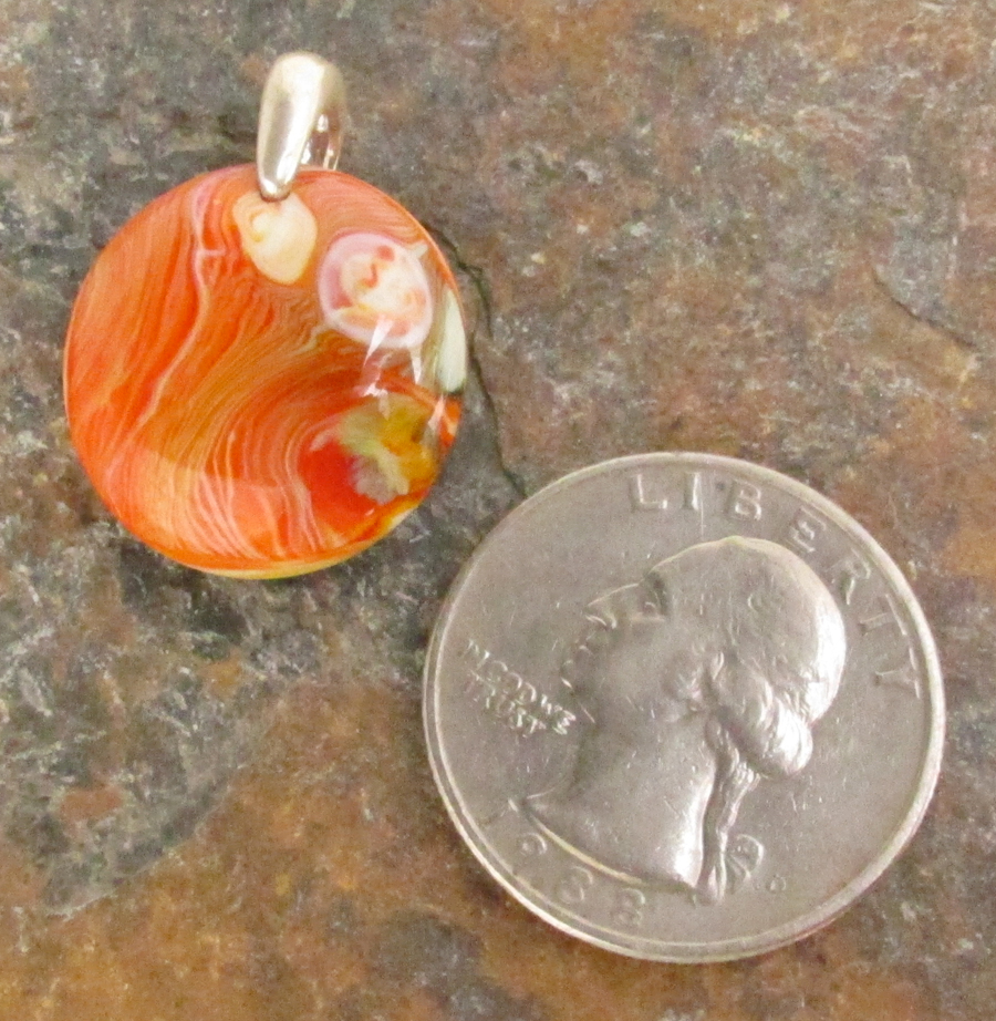 Red, orange, gold, and ivory glass swirl and steam like molten lava. All pendants come with a black waxed cotton cord, but check out the silk ribbons for another fun way to wear it. Bail is sterling silver.