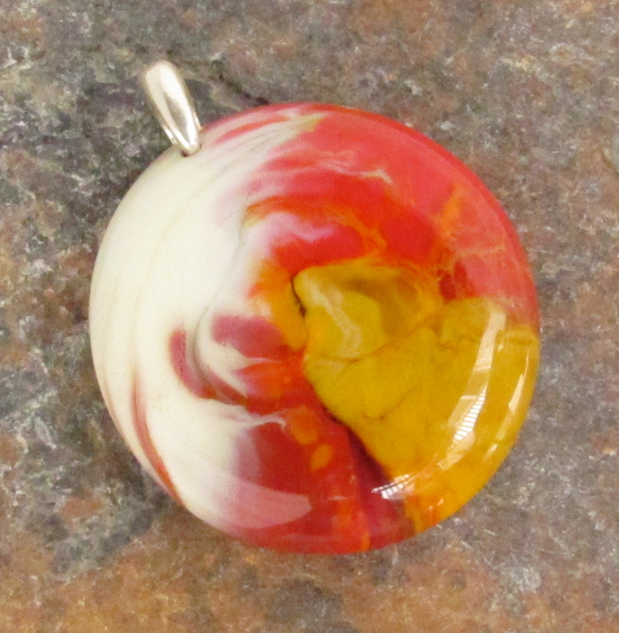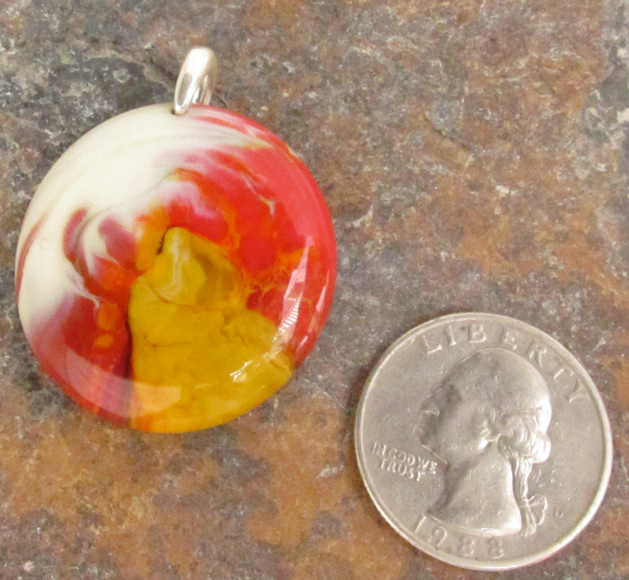 Red, orange, gold, and ivory glass swirl and steam like molten lava. All pendants come with a black waxed cotton cord, but check out the silk ribbons for another fun way to wear it. Bail is sterling silver.
