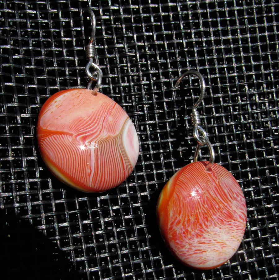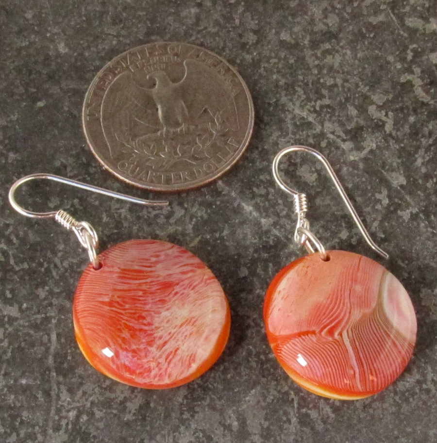 Red, orange, gold, and ivory glass swirl and steam like molten lava. Earwires and other metal findings are sterling silver.
