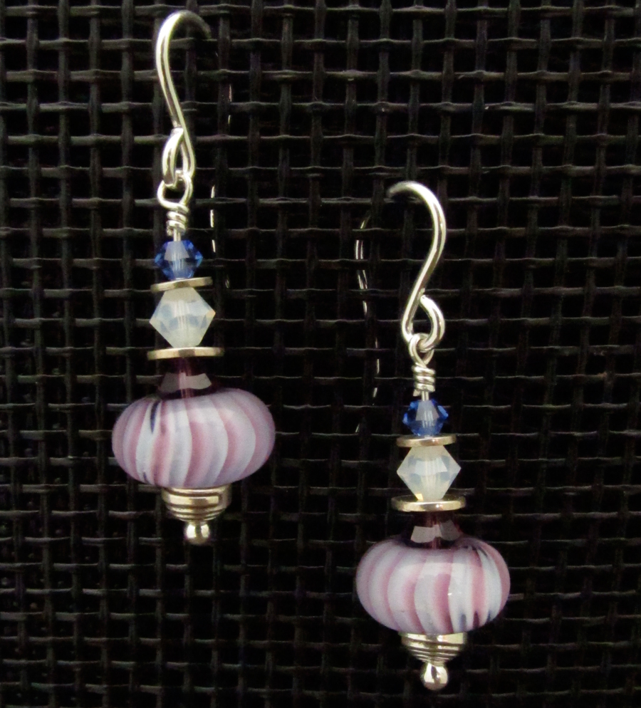 Transparent purple and blue swirl with opaque ivory glass. Earwires and all other metal findings are sterling silver.