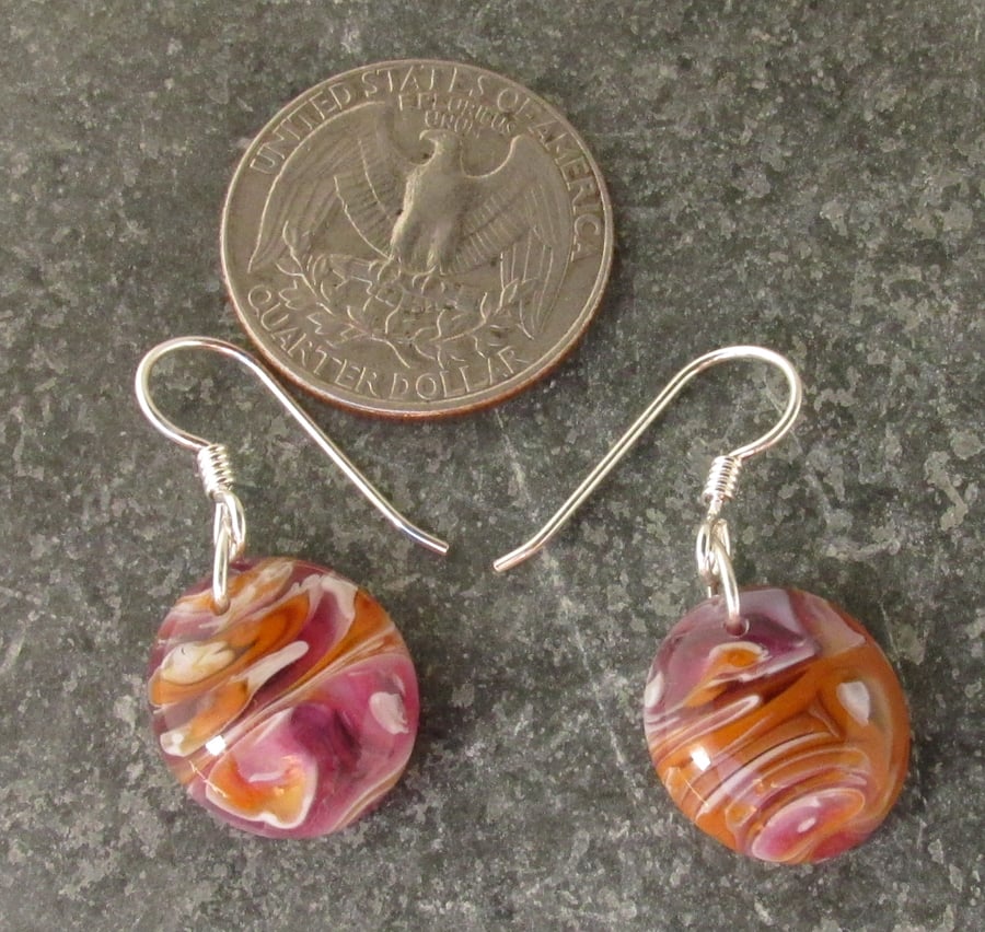 Pink orange, and ivory swirls. This piece also looks great with purples, browns and grays. Works with so much of my wardrobe! Earwires and all other metal findings are sterling silver.