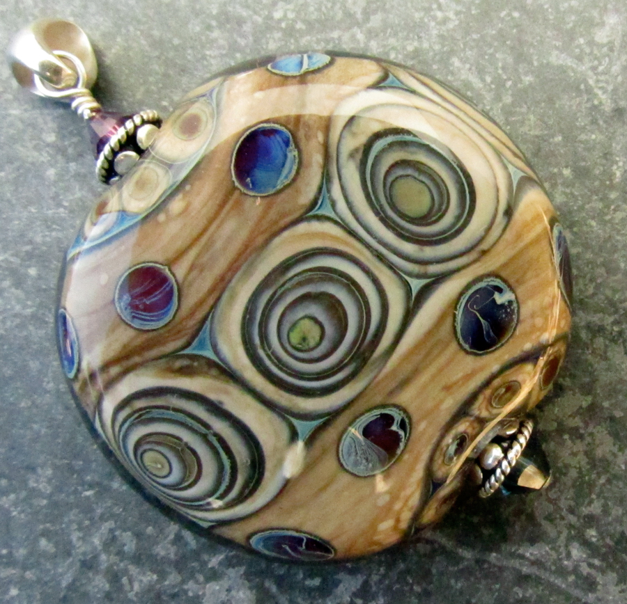 With exceptional depth and detail, this pendant was made in a torch flame from glass rods. All the details are laid in by hand when the bead is hot. The whole bead is encased in clear glass at the end for added dimension. Bail and other findings are sterling silver. Comes with a black waxed cotton cord.